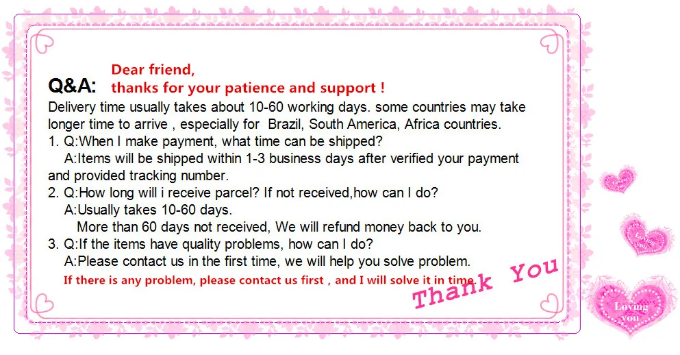 • If you did not receive the product within the guaranteed time( 45 days not including 2-5 day processing) you can request a refund or a reshipment.