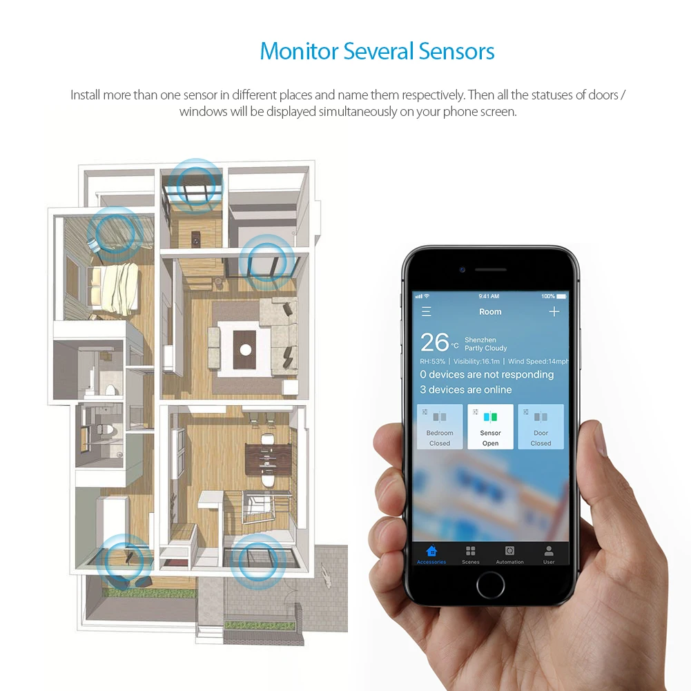 Install more than one sensor in different places and name them respectively. Then all the statuses of doors and windows will be displayed simultaneously on your phone screen.