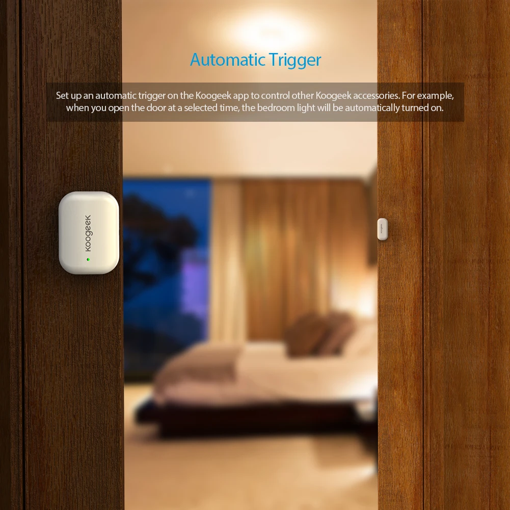 Set up an automatic trigger on the Koogeek Home app to control other Koogeek accessories. For example, when you open the door at a selected time, the bedroom light will be automatically turned on.
