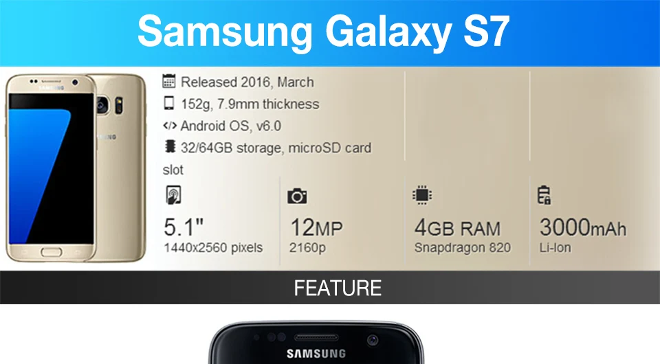 Original Samsung Galaxy S7 Unlocked Quad Core 5.1 Inch 4G RAM 32G ROM LTE 4G 12MP Camera 3000mAh 1440×2560 Android Mobile Phone