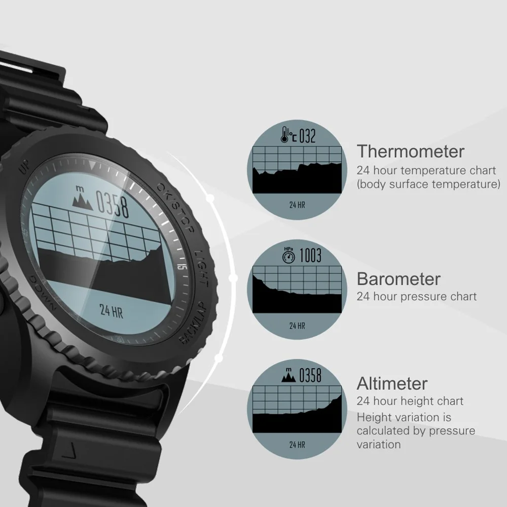 Altimeter, Barometer, Thermometer, Weather and Compass functions measure the local environment and help you formulate accurate outing plans. Pedometer, Calories, History record let you know how you performed.