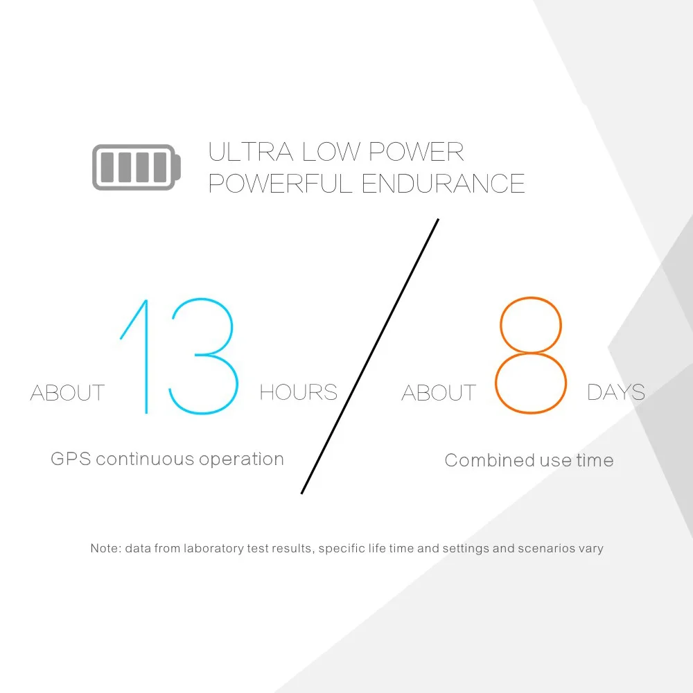 Built-in 500mAh Rechargeable Battery takes only 2 hours to full charge, 3-4hours for GPS mode, 3-4 days for normal usage, standby up to 8days.