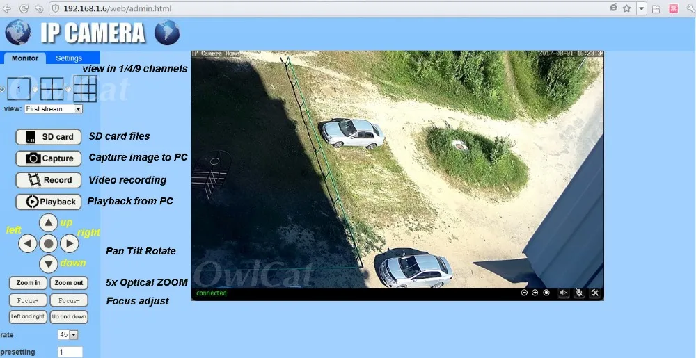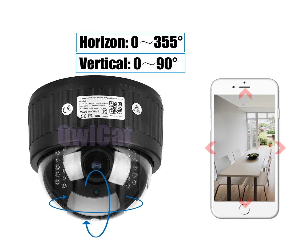Camera can remotely rotate control from phone or PC, Horizon: 0~355°, Vertical: 0~90°