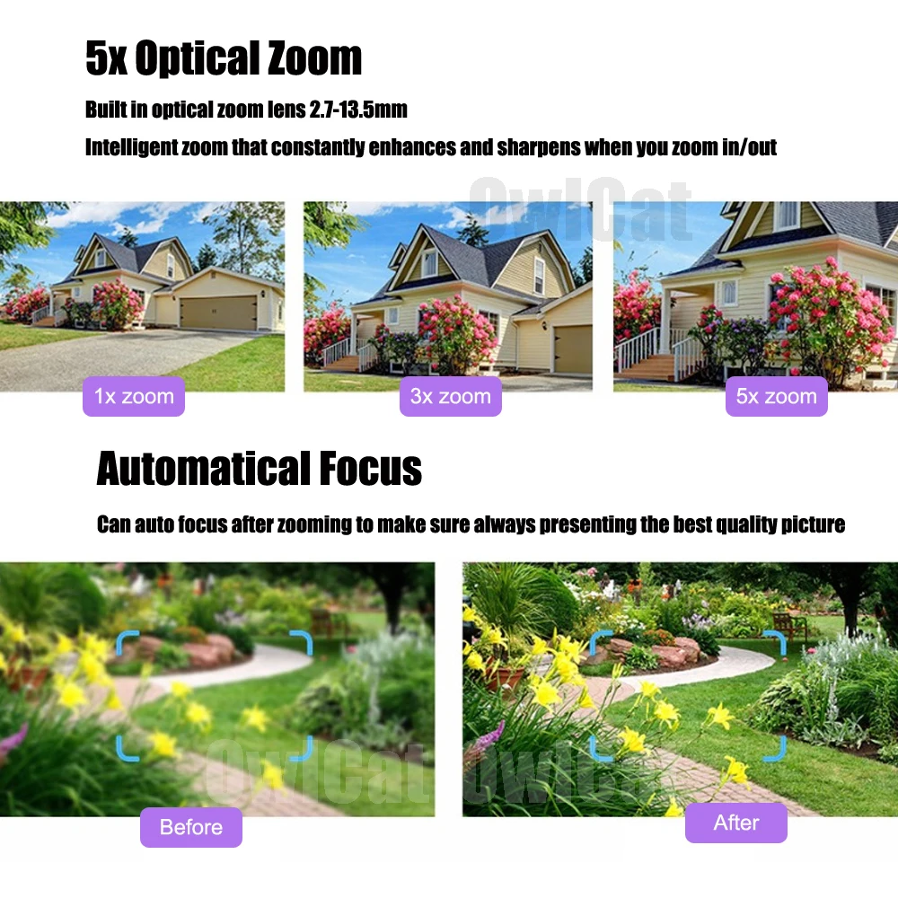 2.7-13.5mm 5X optical zoom auto focus lens, provide wide view angle 96°~26.2°, you can remotely control PTZ from phone or PC easily