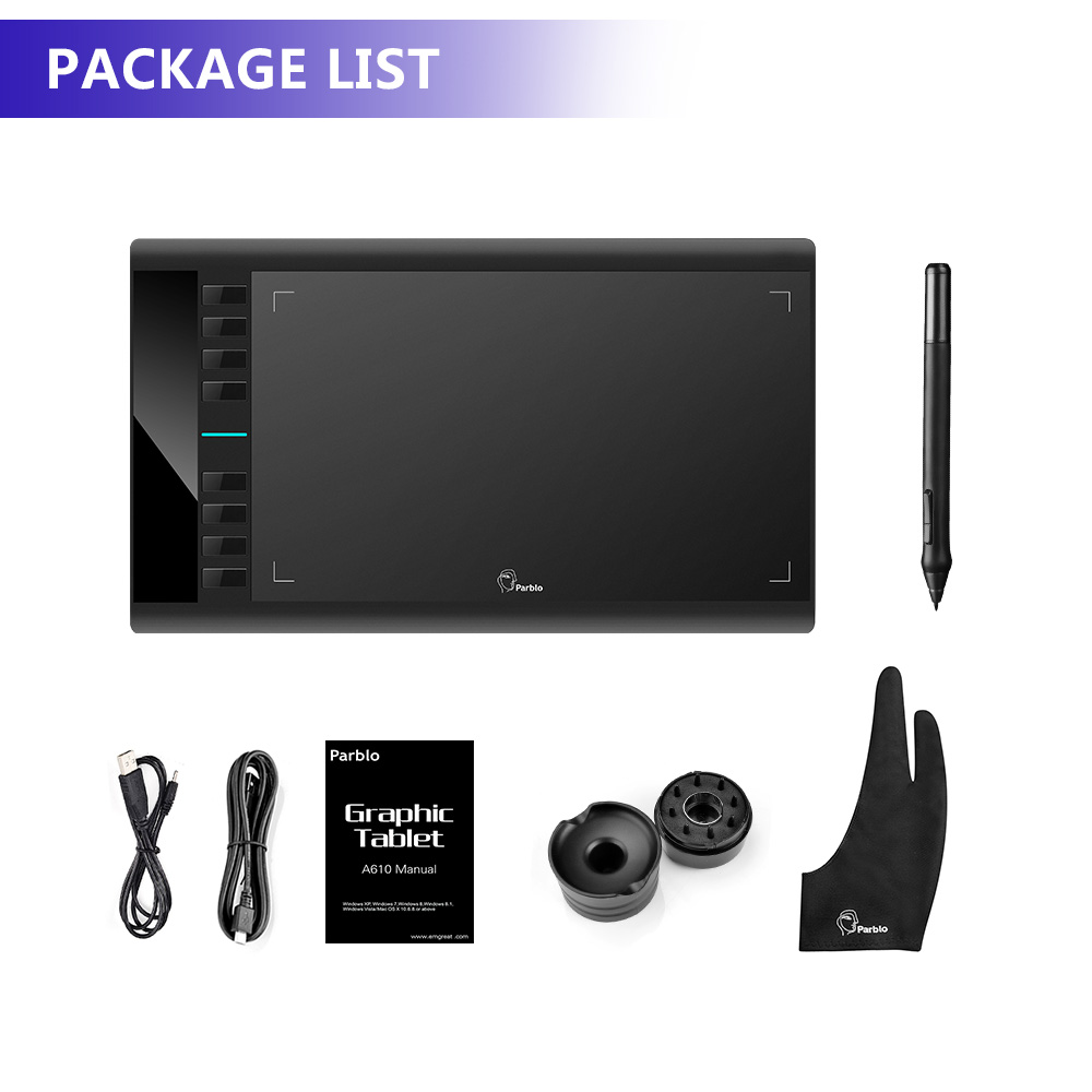 Parblo A610 Digital Tablet Graphics Drawing Tablet Pad w/Pen 2048 Level Digital Pen + Anti-fouling Glove as Gift