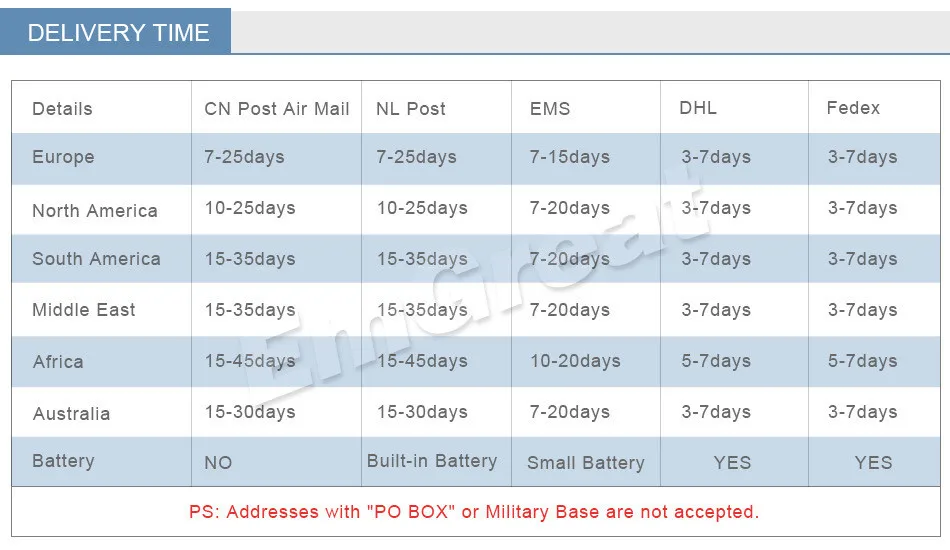 Packages from our warehouse in China will be shipped by ePacket or EMS depending on the weight and size of the product. Packages shipped from our US warehouse are shipped through USPS.