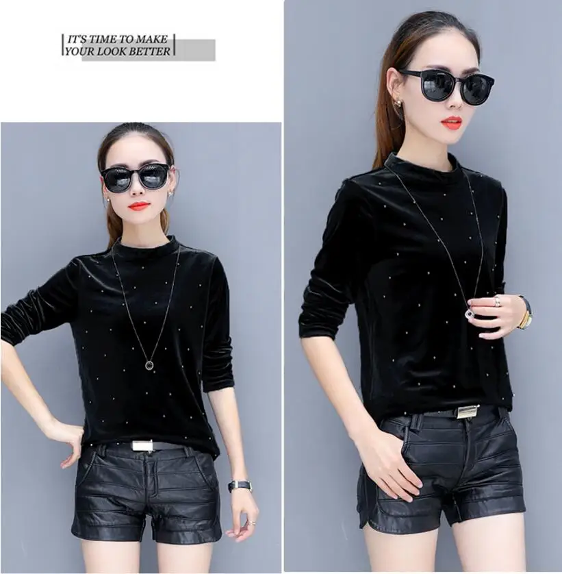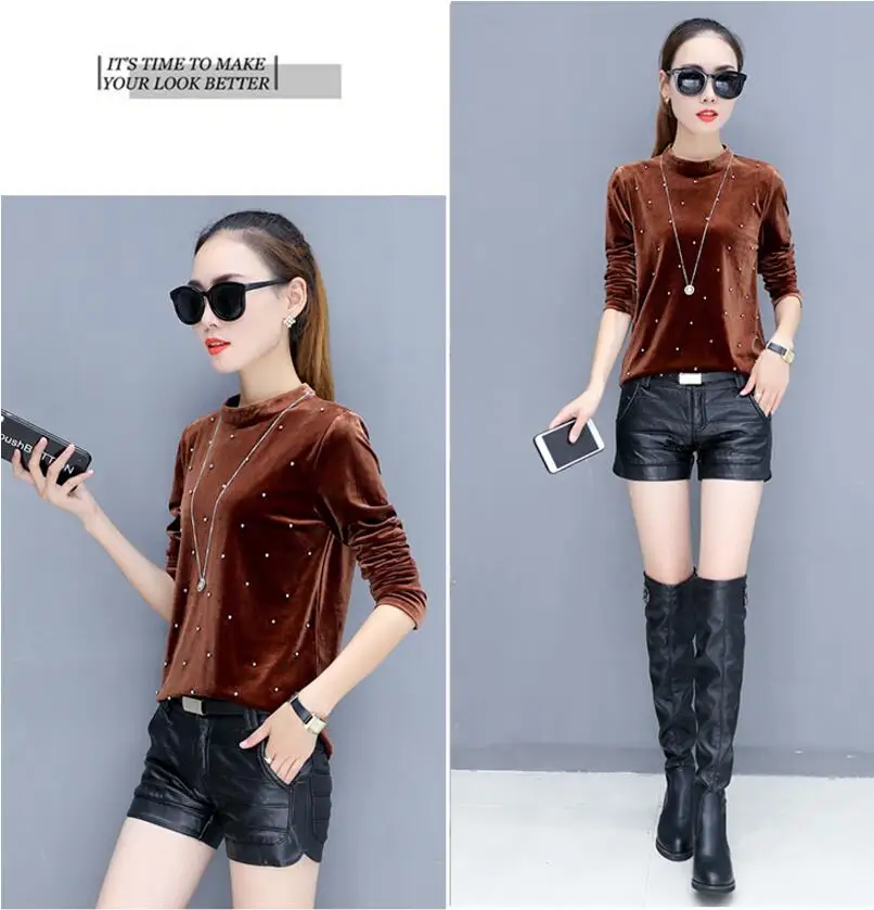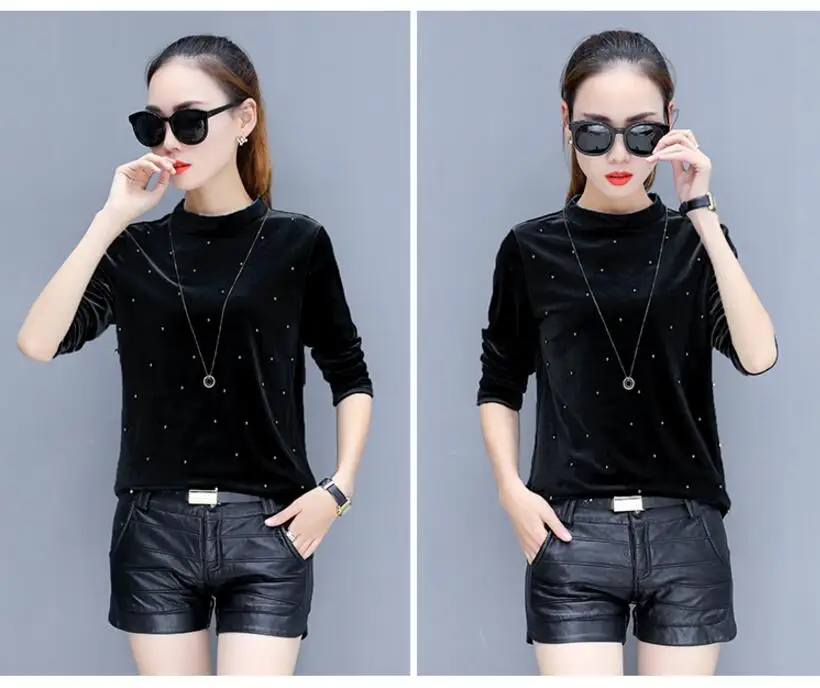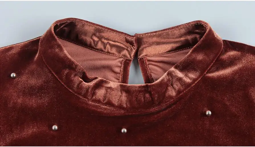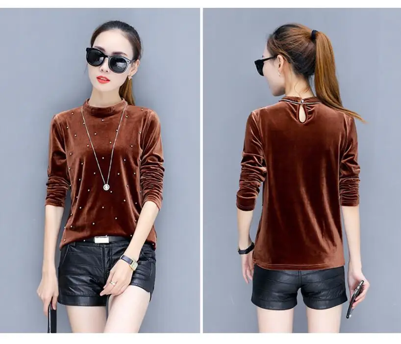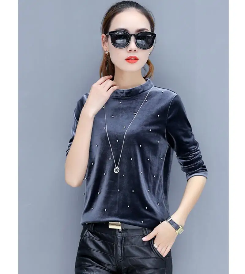 Pearl Beading Blouses 2018 Autumn Women Velvet Blouse Long Sleeve Casual Shirt Women Tops O-neck Elegant Ladies Camisas Mujer
