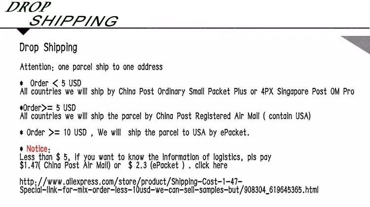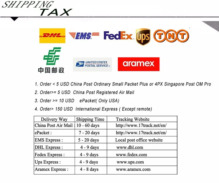 Packages from our warehouse in China will be shipped by ePacket or EMS depending on the weight and size of the product. Packages shipped from our US warehouse are shipped through USPS.