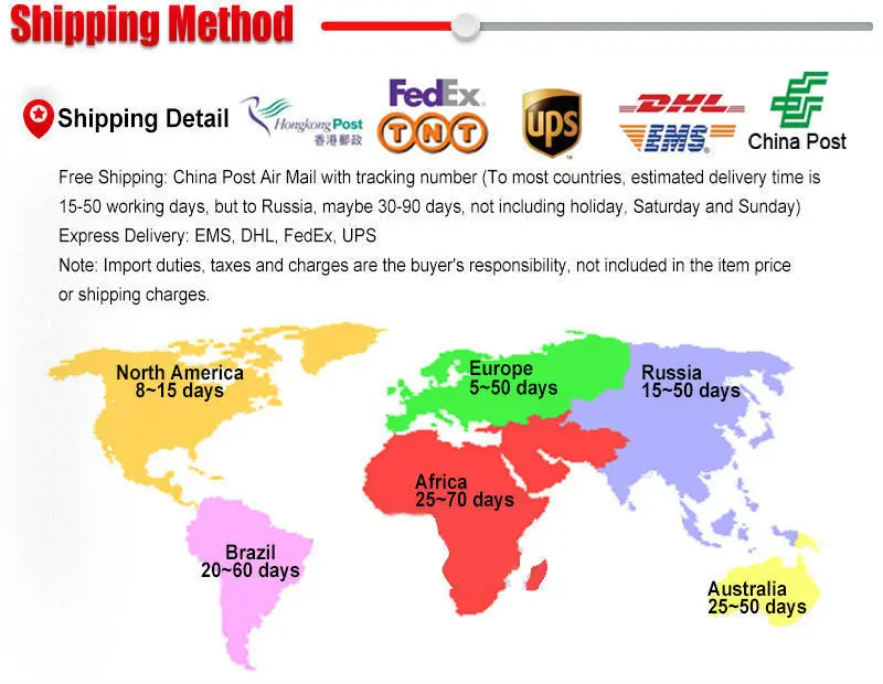 Packages from our warehouse in China will be shipped by ePacket or EMS depending on the weight and size of the product. Packages shipped from our US warehouse are shipped through USPS.