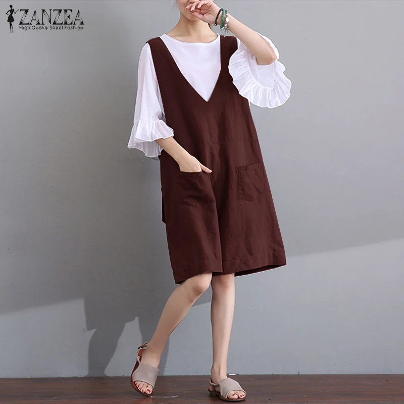 Plus Size 2018 Fashion ZANZEA Women Summer Retro V Neck Sleeveless Casual Loose Rompers Pockets Solid Short Jumpsuits Overalls