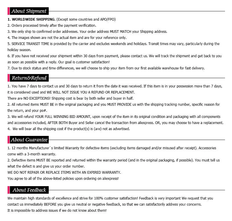 • If you did not receive the product within the guaranteed time( 45 days not including 2-5 day processing) you can request a refund or a reshipment.