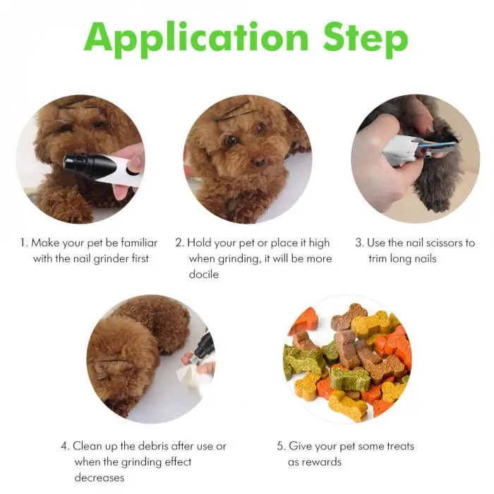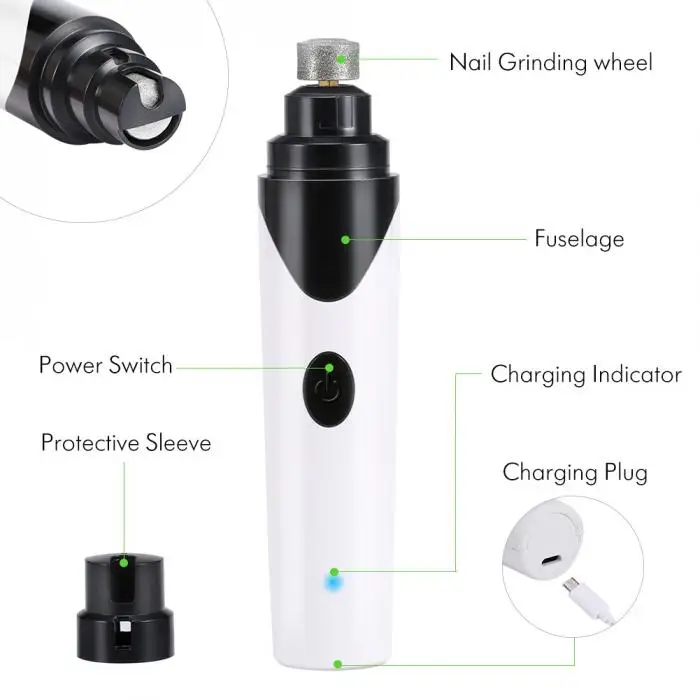Then: Holding the Electric Nail Trimmer Clipper with one of your hands, holding the pet nails with the other hand, put its nail into a port gently, and then begin to grind.