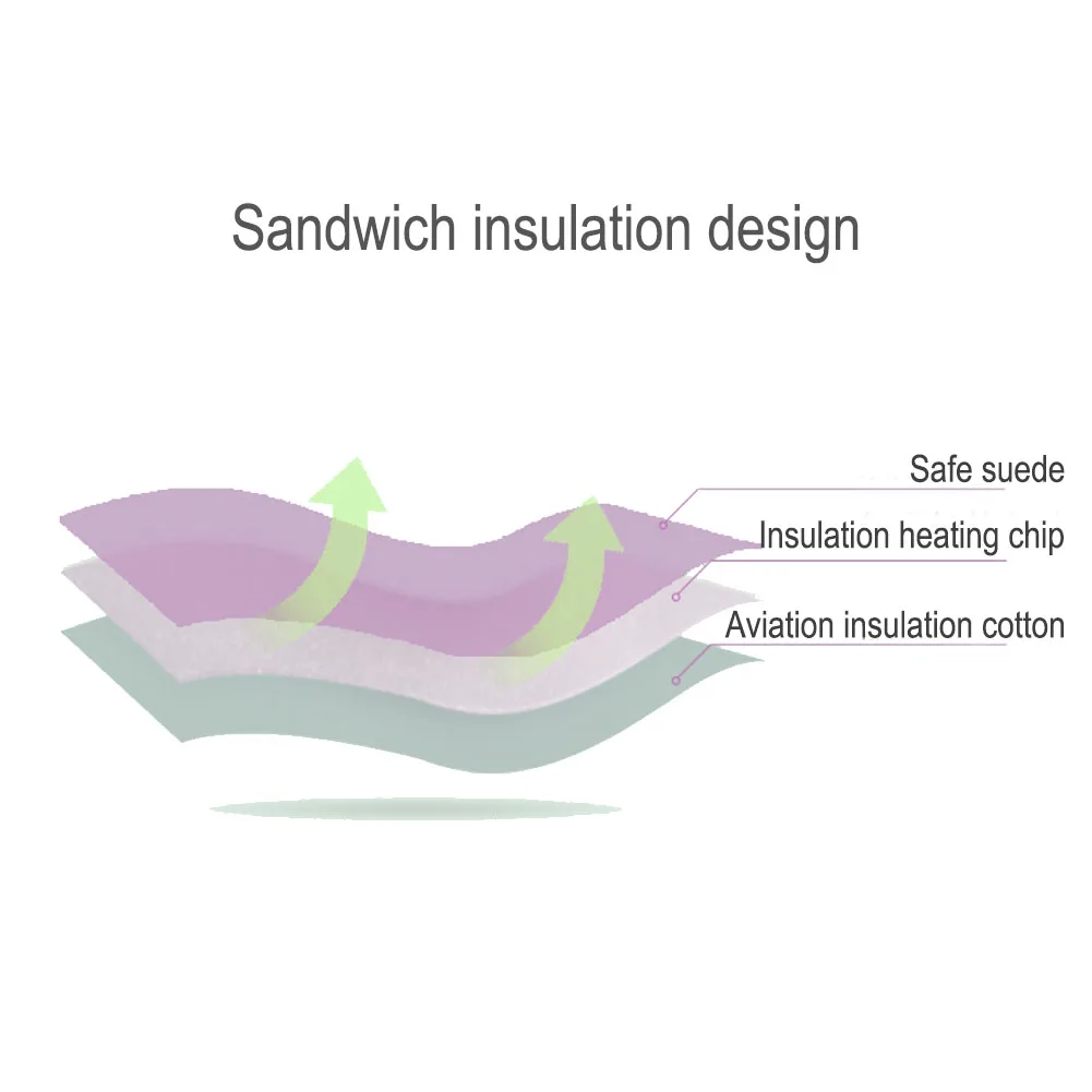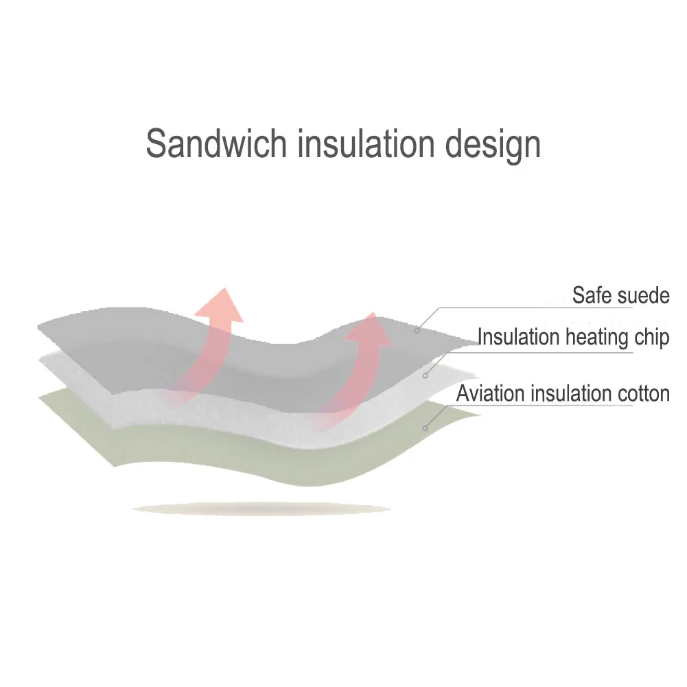 1. Sandwich insulation design: suede, insulation heating chip, aviation thermal insulation cotton, insulation heating core fireproof treatment, safe and secure.