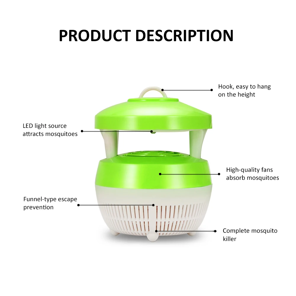 This LED light adopt UV light to lure mosquito and fly to the mosquito box, and the mosquito get trapped till their death.