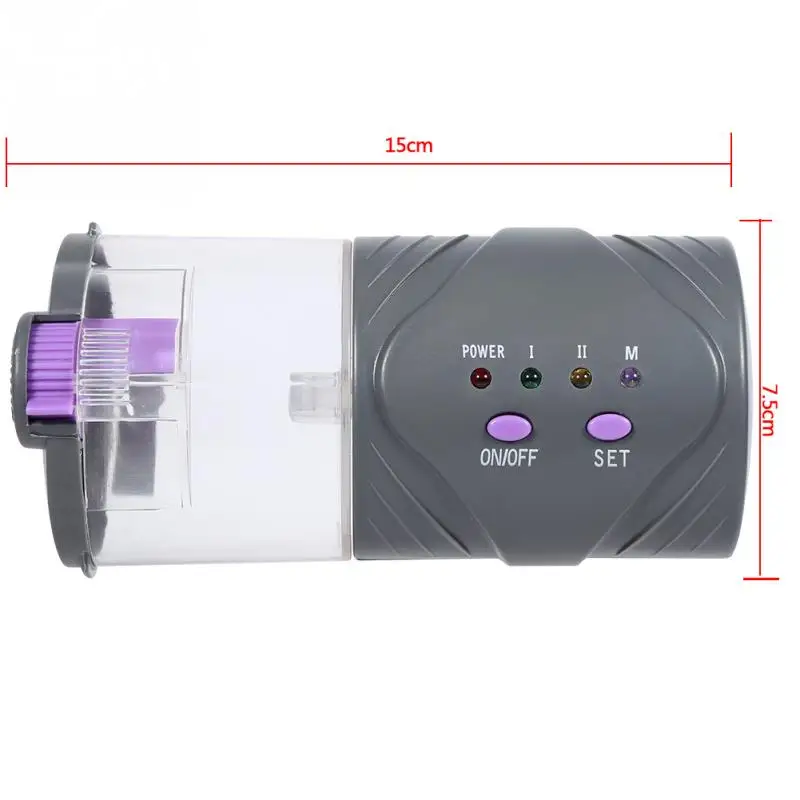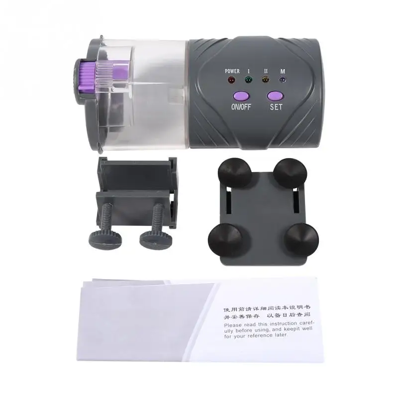 This fish feeder can feed fish automatically(for flake, pellet and tablet food) when you are away from home. It adopts DC micro-motor to control, environmental-friendly plastic material. Safe to use. The feeder has large capacity, you can set the timer(12/24 hour) by yourself. It is powered by 2pcs 1.5V AA batteries, low consumption for operation. Adjustable switch is convenient for you to adjust the food outlet according to the fish needs.