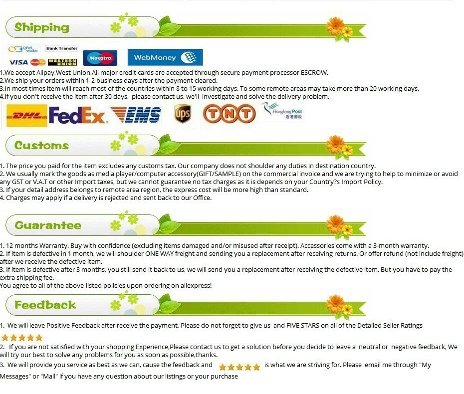• If you did not receive the product within the guaranteed time( 45 days not including 2-5 day processing) you can request a refund or a reshipment.