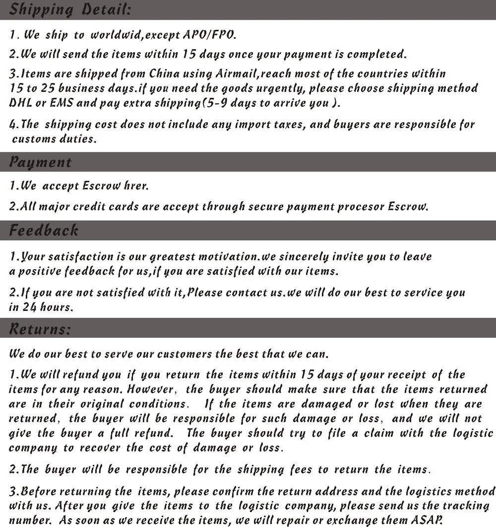 We are not responsible for any custom fees once the items have shipped. By purchasing our products, you consent that one or more packages may be shipped to you and may get custom fees when they arrive in your country.