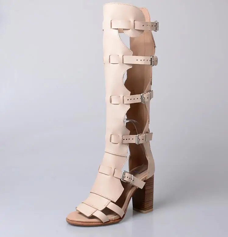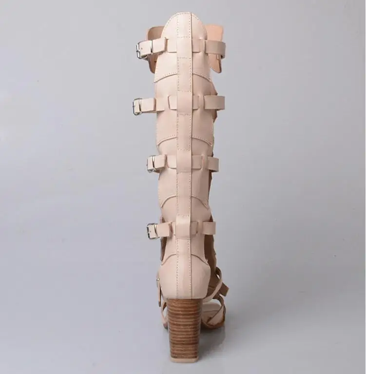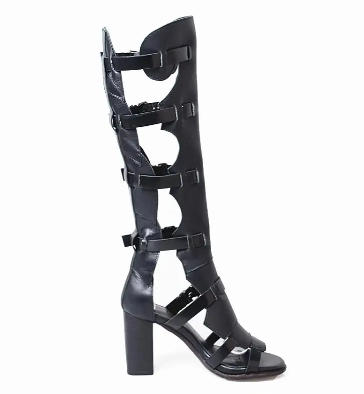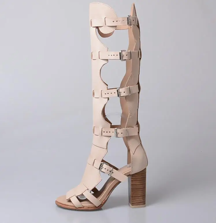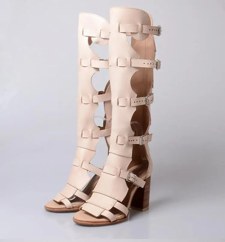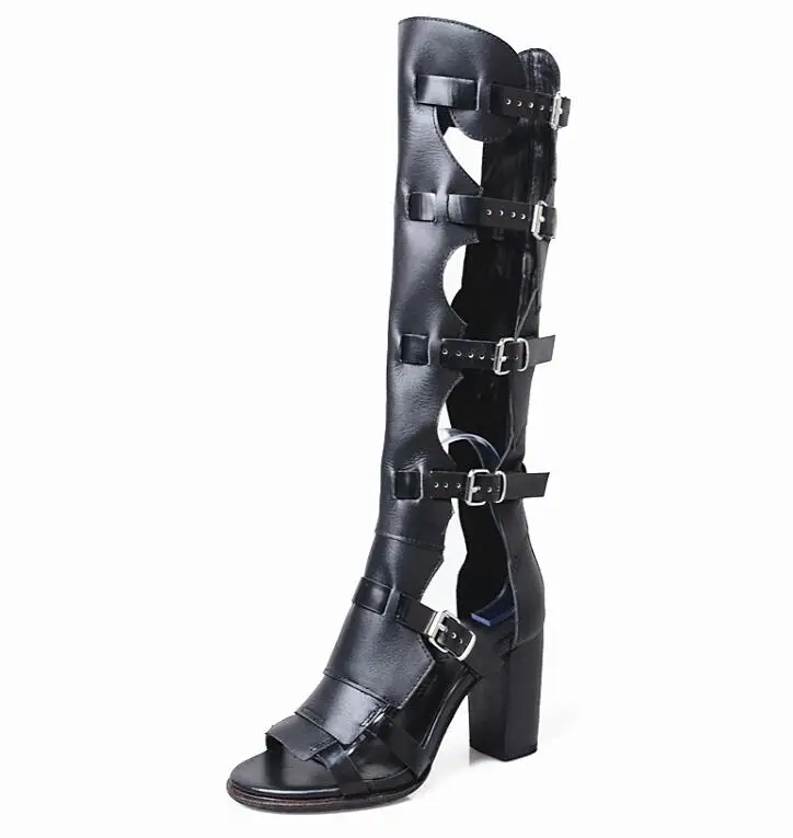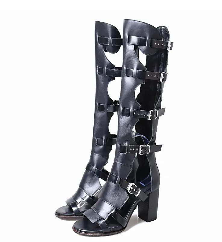 Prova Perfetto Fashion Sexy Ladies Knee High Boots Sandals Hollow Out Buckle Belt Square High Heel Women’s Gladiator Sandals Boots