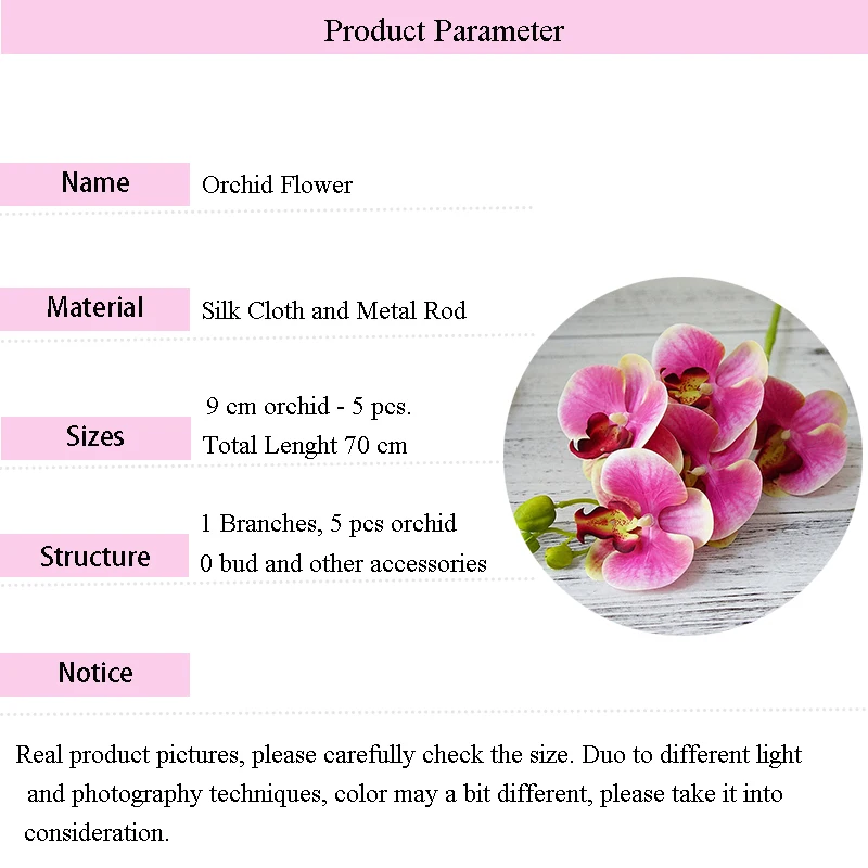Sizes: Total Length is 70 cm, 9 cm orchid and 1 cm buds.