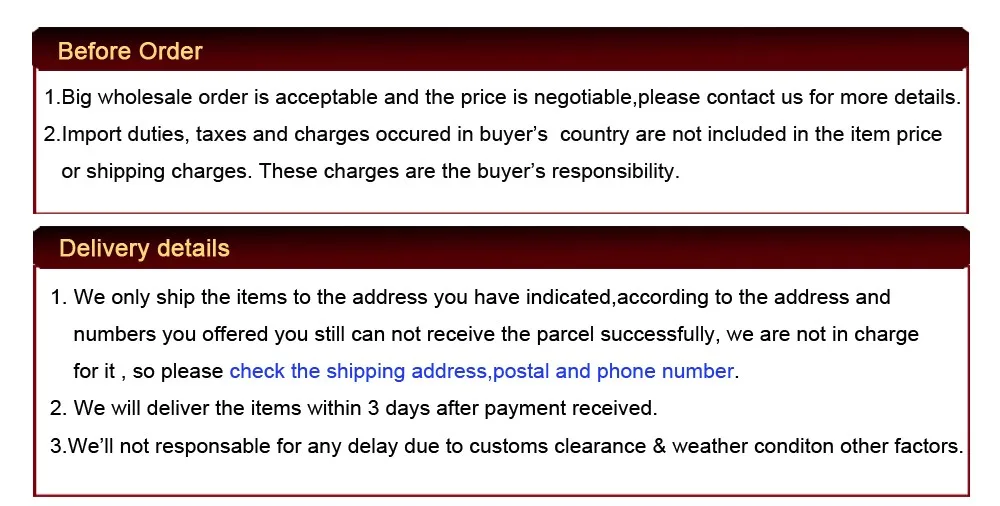 We are not responsible for any custom fees once the items have shipped. By purchasing our products, you consent that one or more packages may be shipped to you and may get custom fees when they arrive in your country.