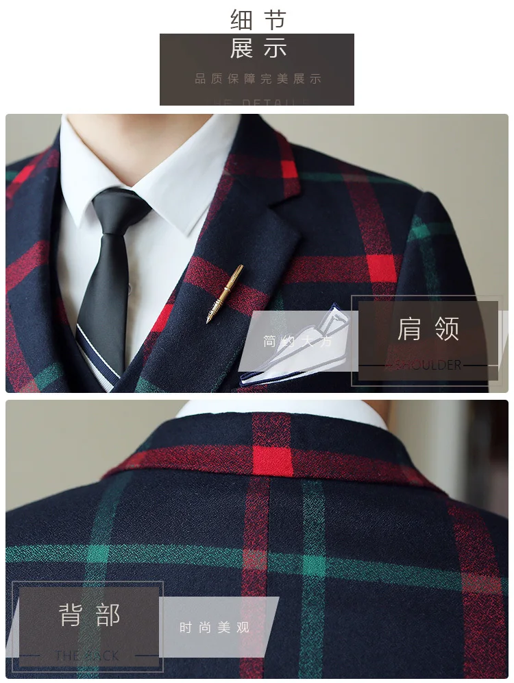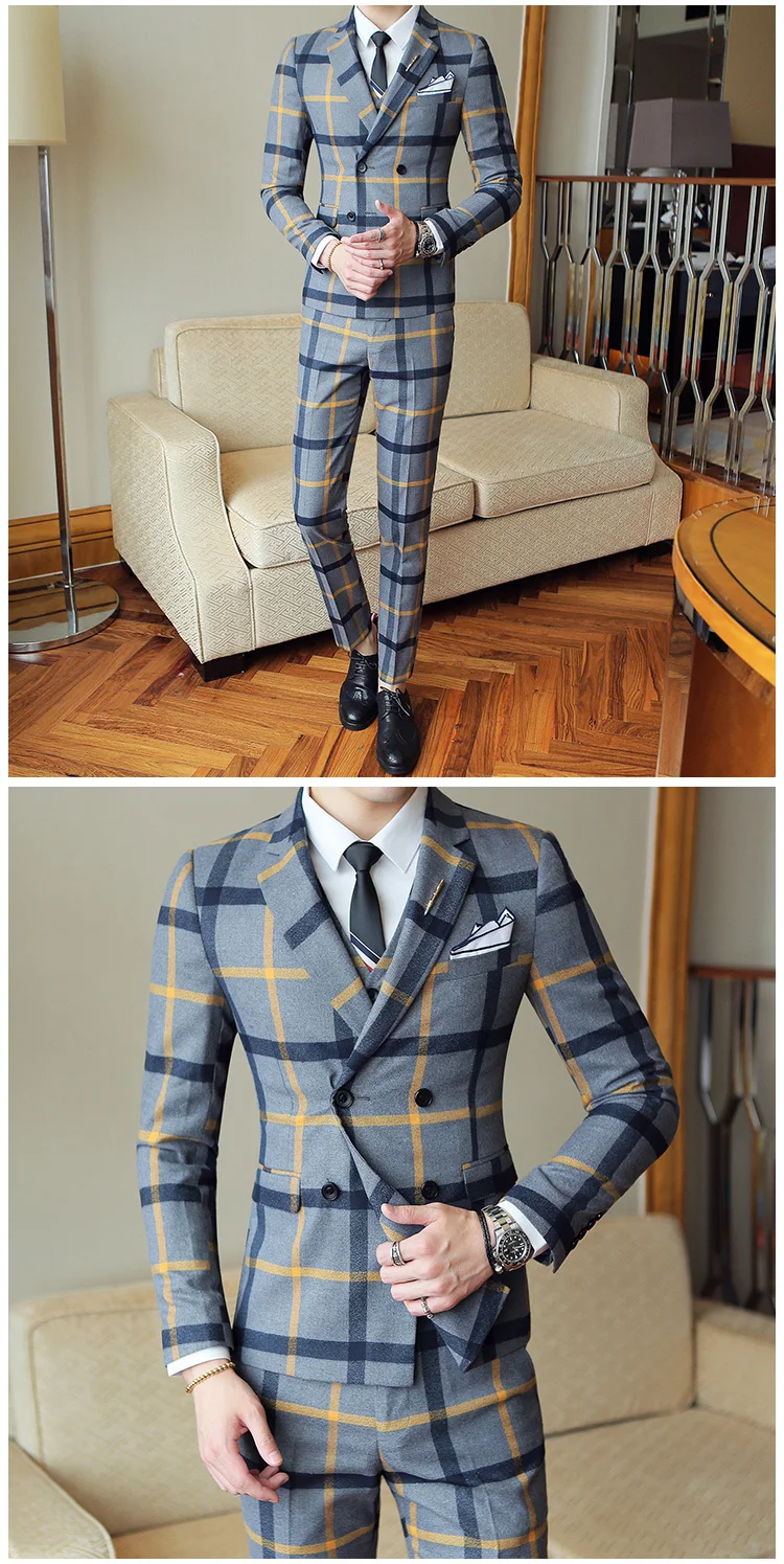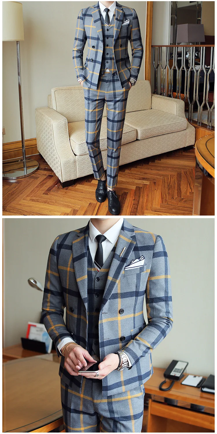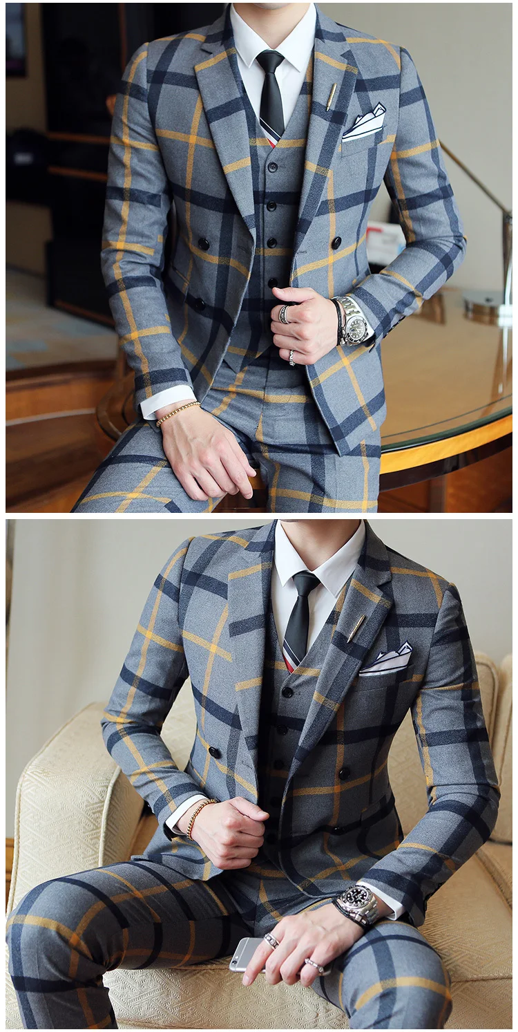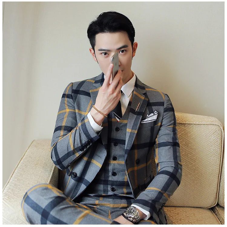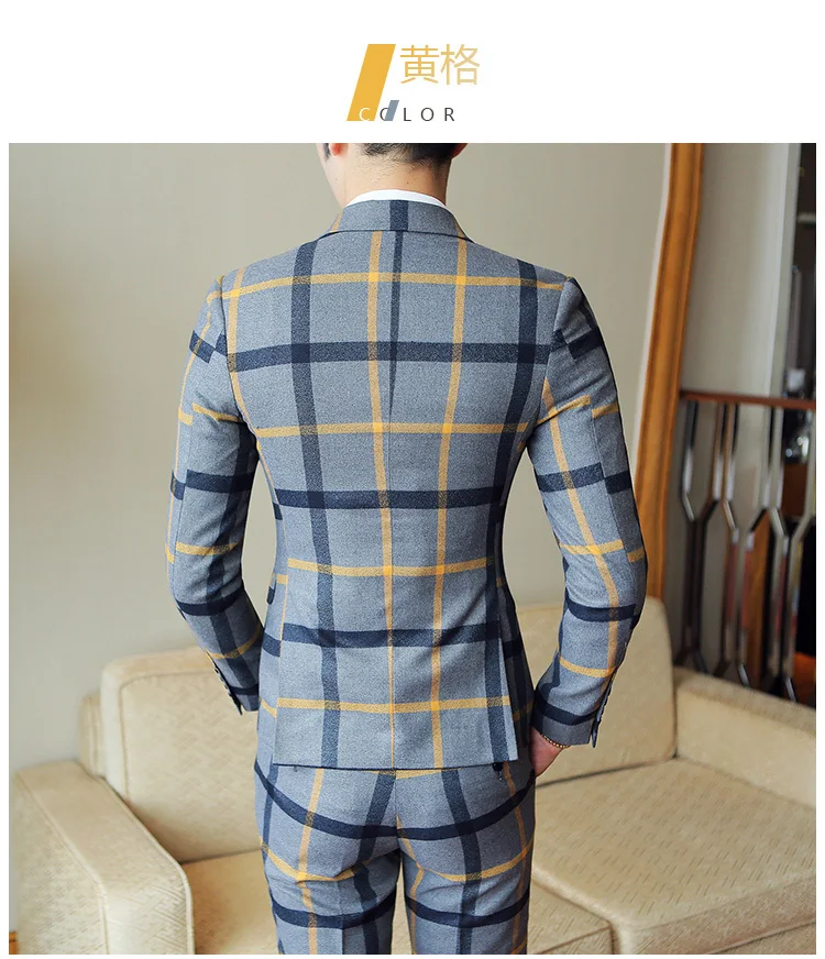 (Jacket + pants) Spring Plaid Suit Groom Marriage …
