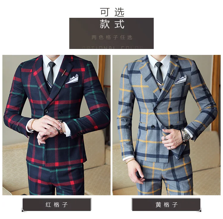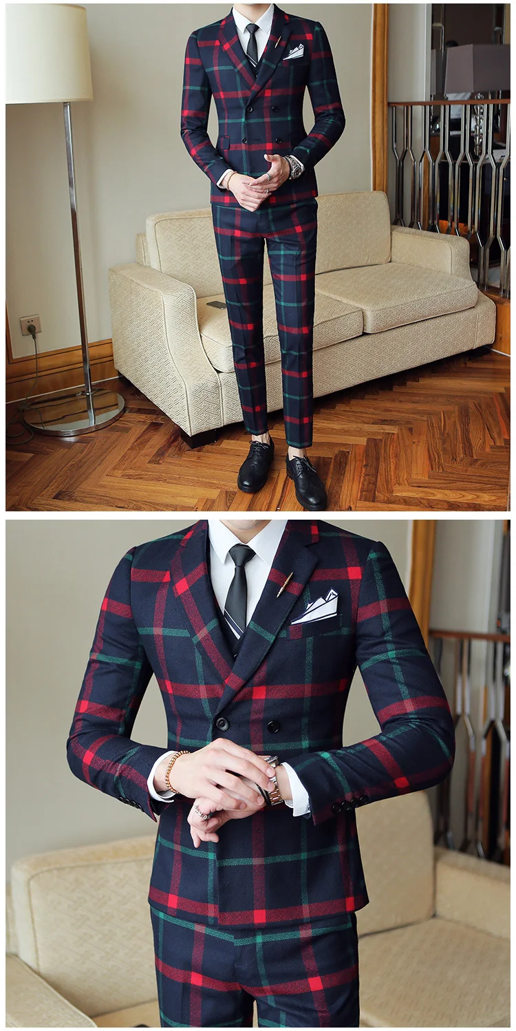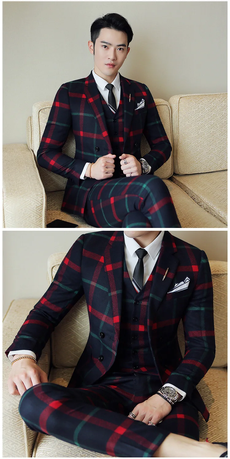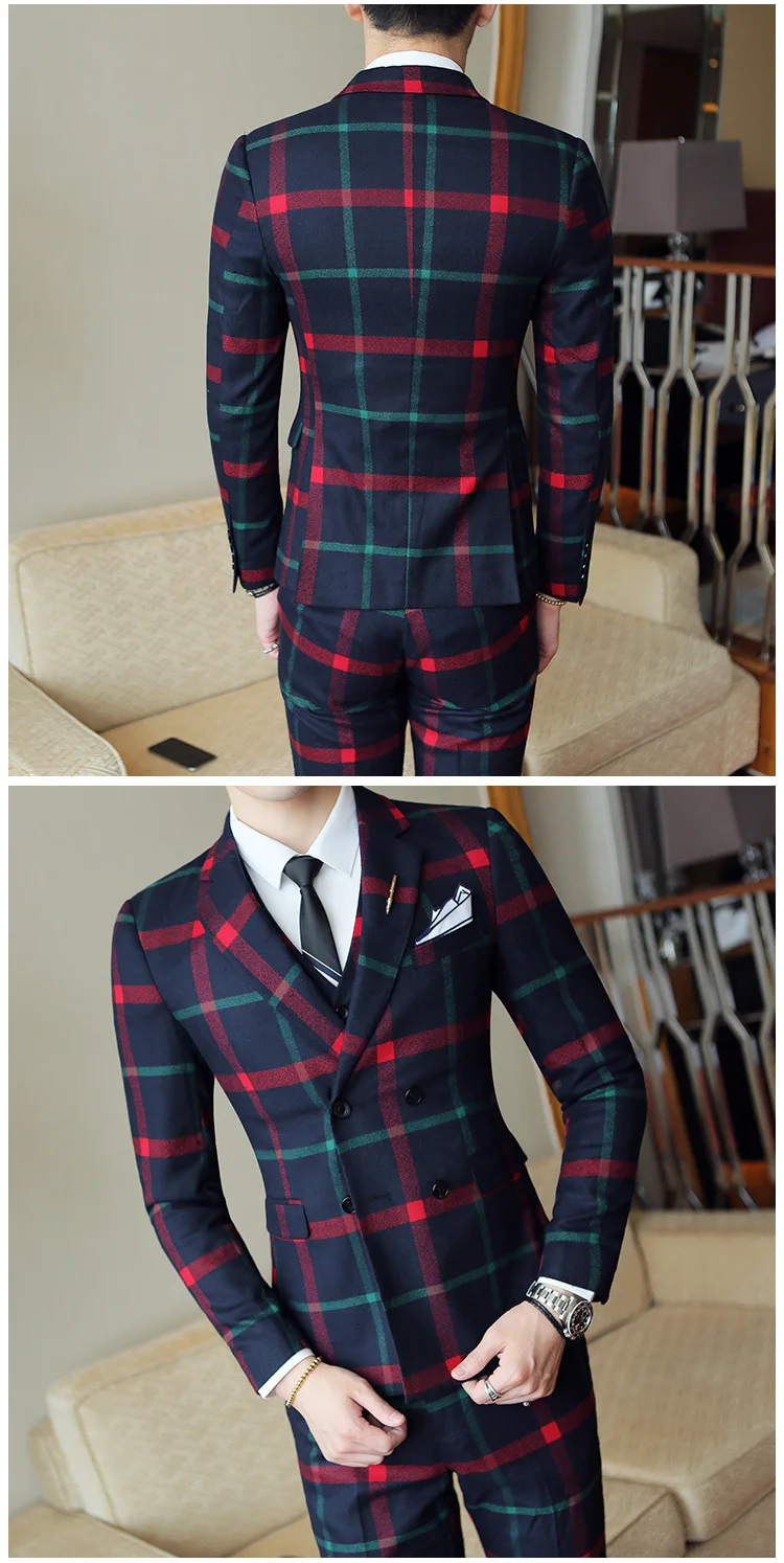 Red Chess Suit For Men (Jacket + Vest + Pants) 2018 New Wedding Party Men’s Suits Costume Mariage Homme Men’s Check British Styl