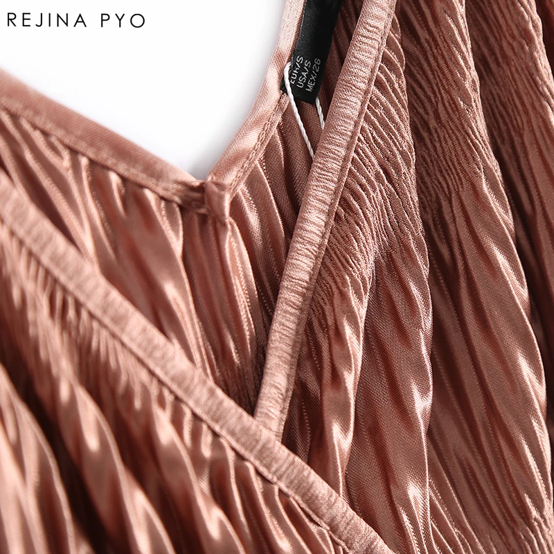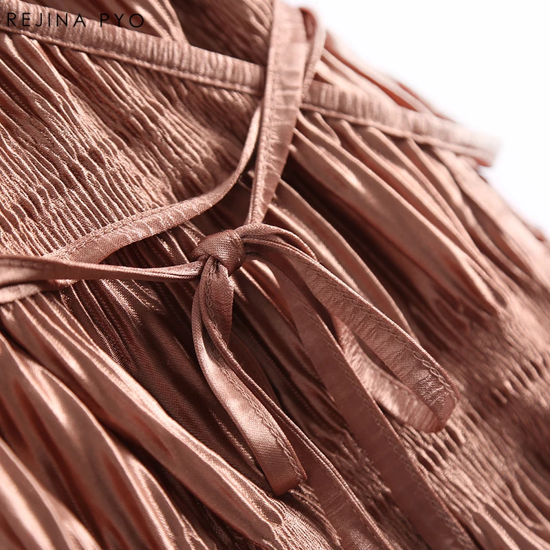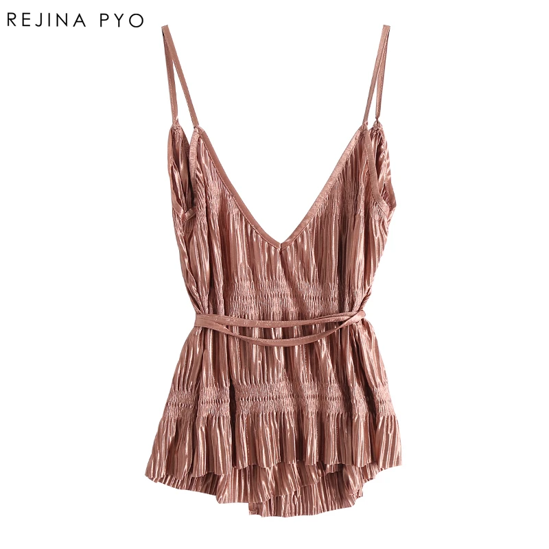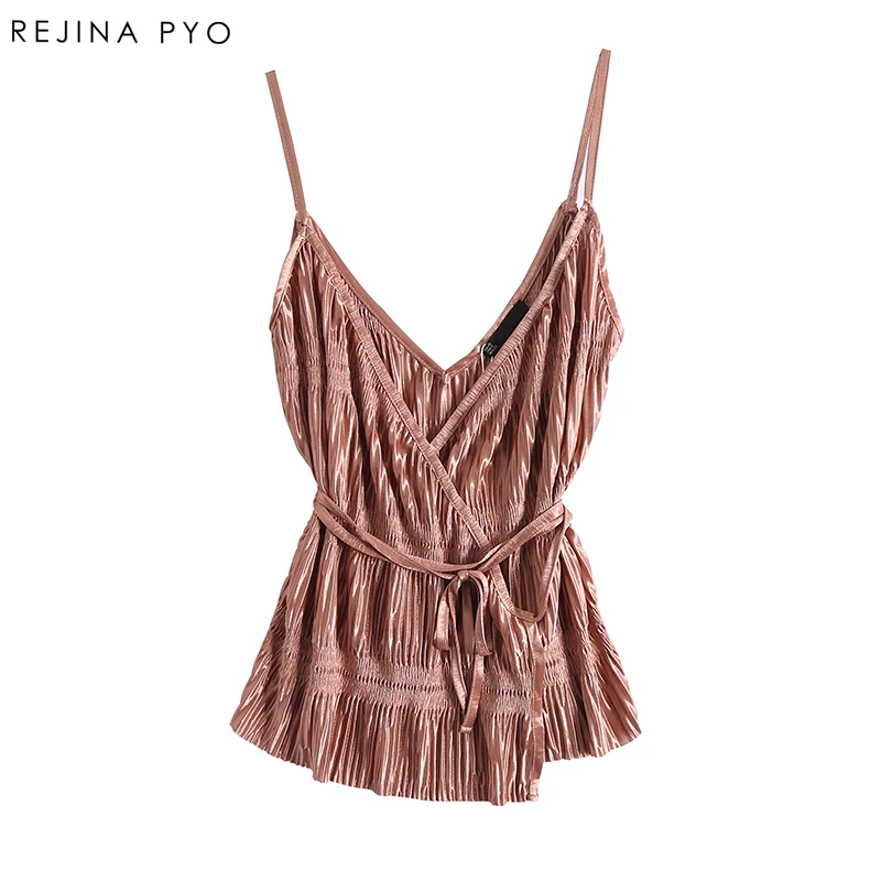REJINAPYO Women Sexy Solid Short Camis Double V-neck Sleeveless Female Casual Pleated Tank Tops Sashes Ladies Elegant Camis