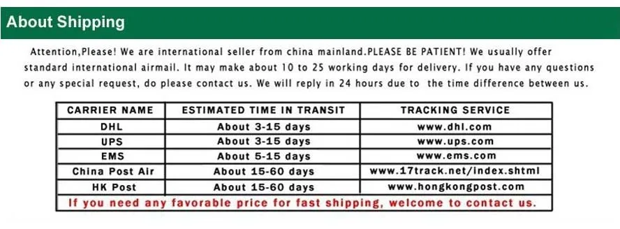 Packages from our warehouse in China will be shipped by ePacket or EMS depending on the weight and size of the product. Packages shipped from our US warehouse are shipped through USPS.