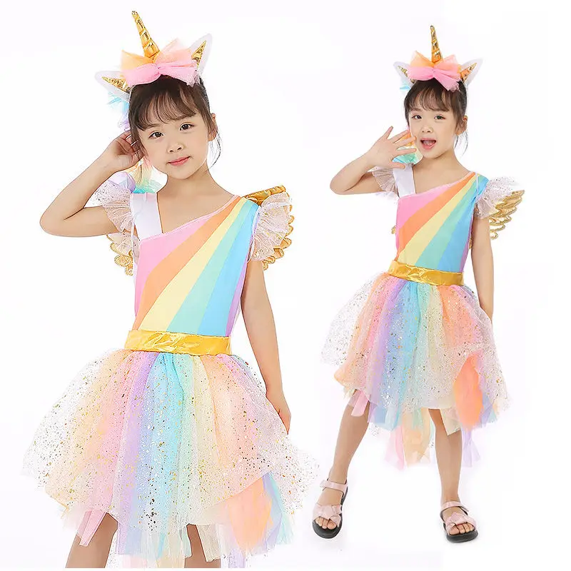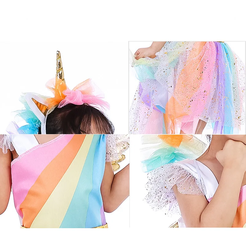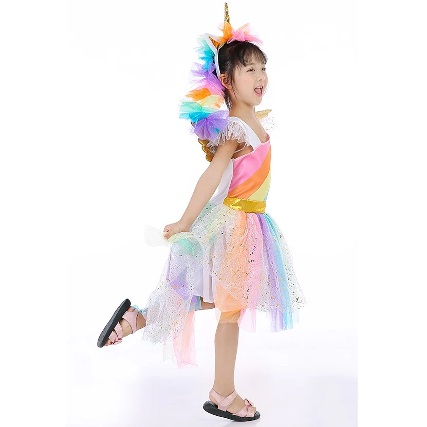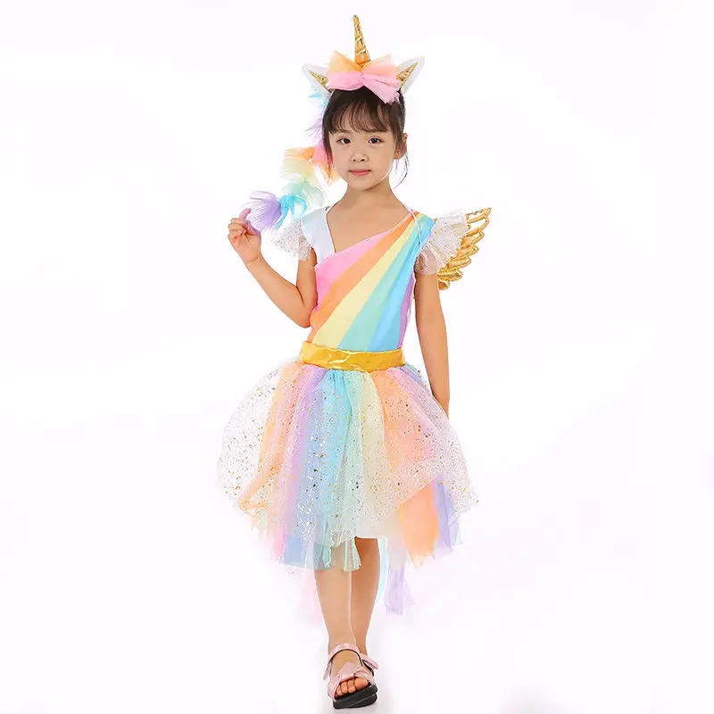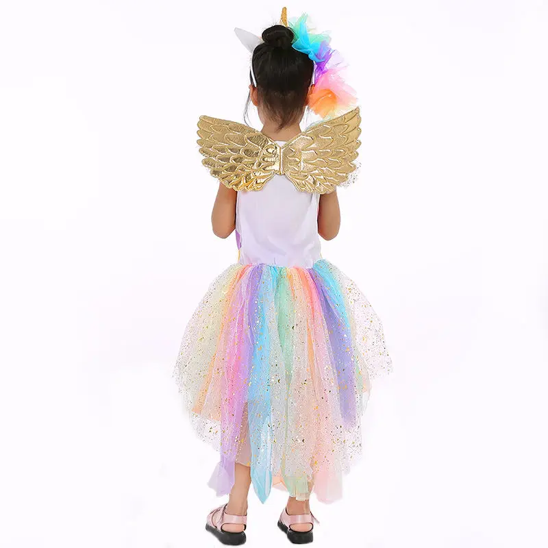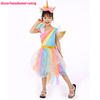 Retail Children Girl Costume Rainbow Unicorn Dress Kids Girl Halloween Party Dress With Head wear+Wing Girl Tutu Dress DJS01