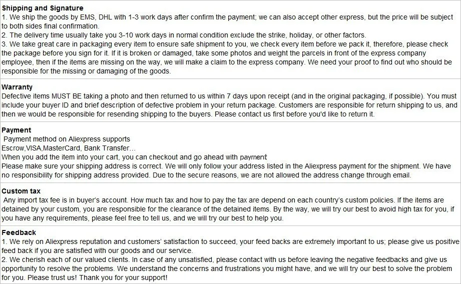 • If you did not receive the product within the guaranteed time( 45 days not including 2-5 day processing) you can request a refund or a reshipment.