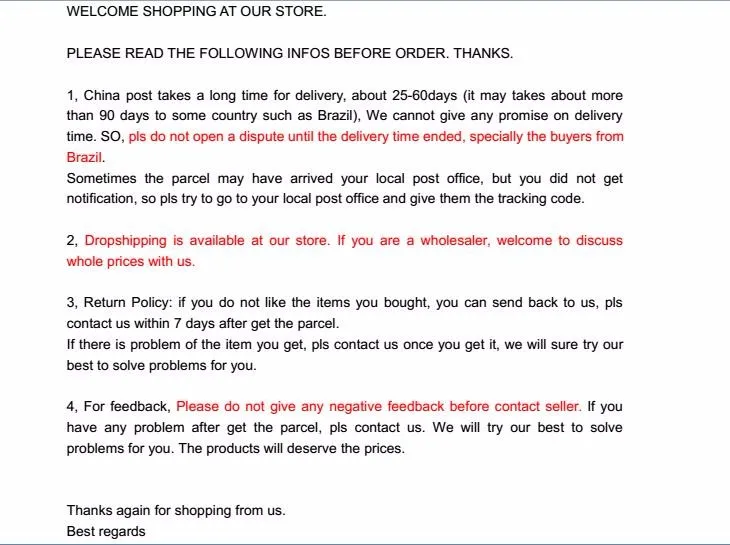 • If you did not receive the product within the guaranteed time( 45 days not including 2-5 day processing) you can request a refund or a reshipment.