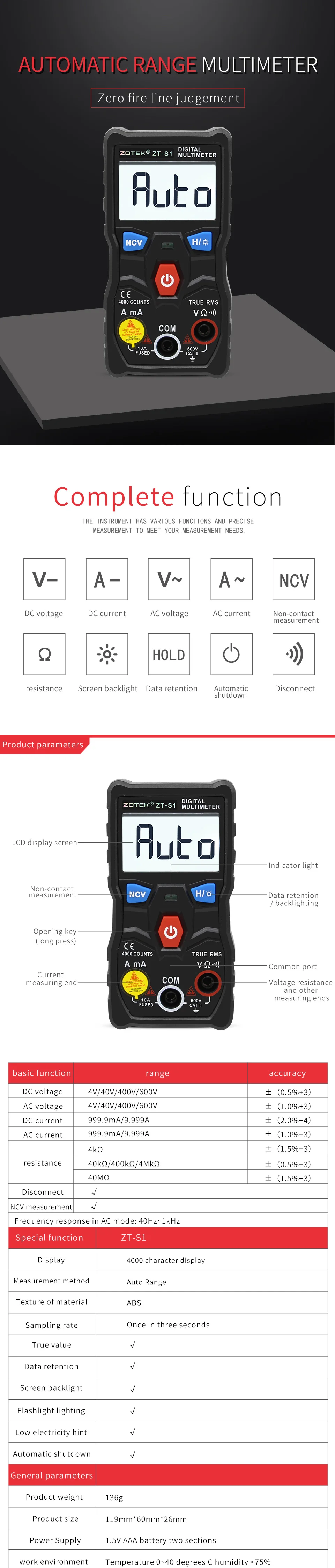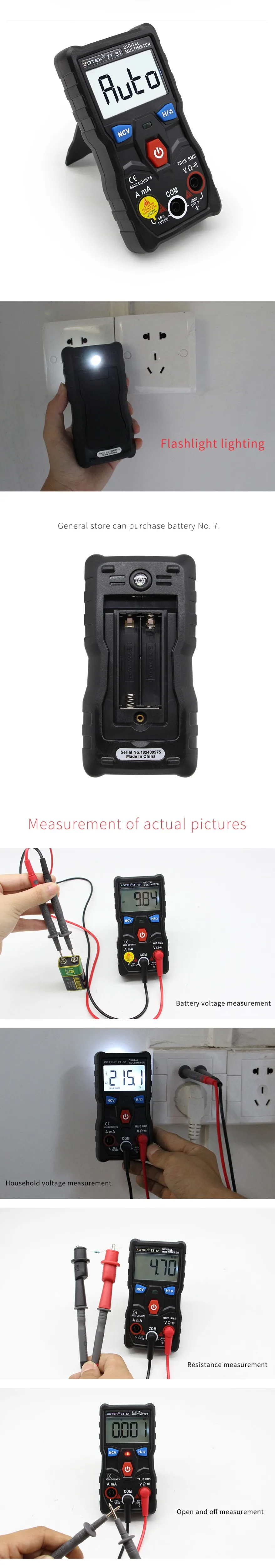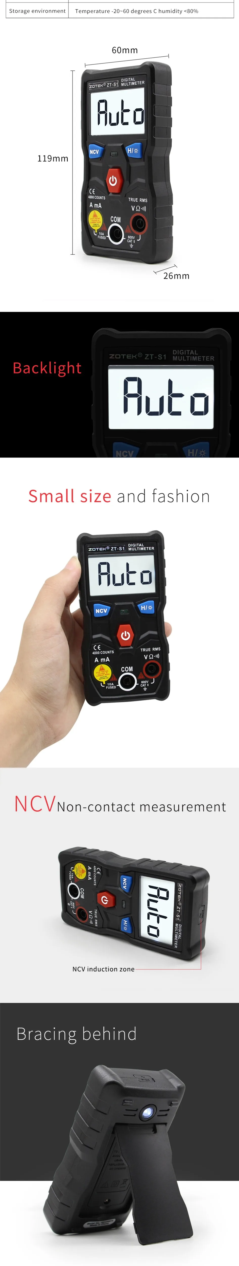 ZOYI ZT-S1 LCD Digital Multimeter Tester 4000 Counts Auto Range True RMS Backlight Automotriz Mmultimetro with NCV DATA HOLD