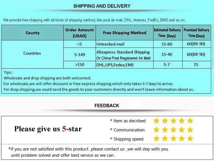 for wholesale, we will offer edition or free delivery on the basis of the quantity you want to order. the transportation time is about 3 to 7 working days (if you want to give us to a third party, we can ship cargo to your customer directly. please be focusing and trust us, we won’t leave any information about us.