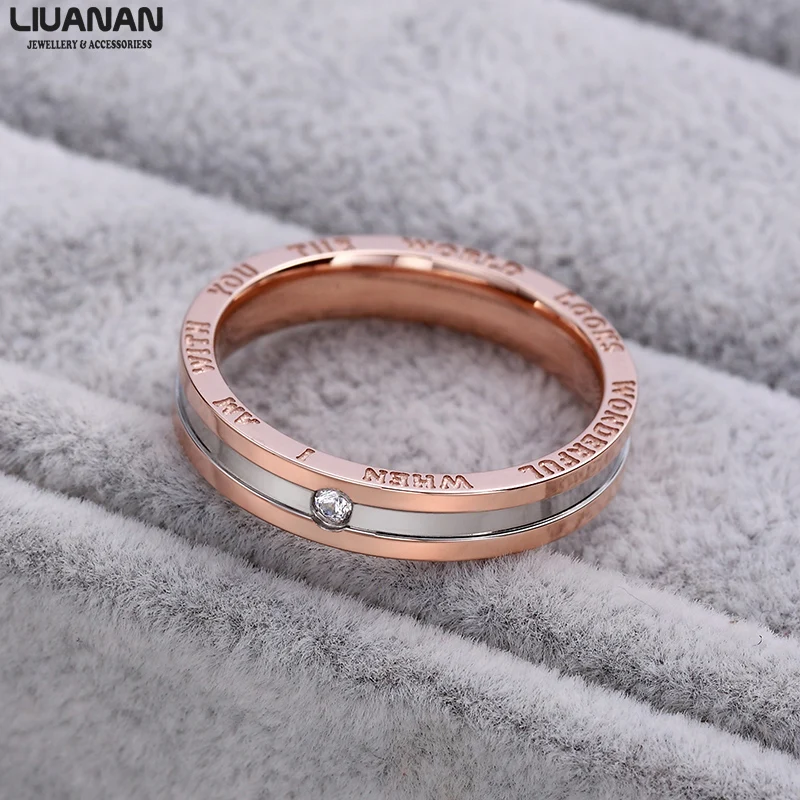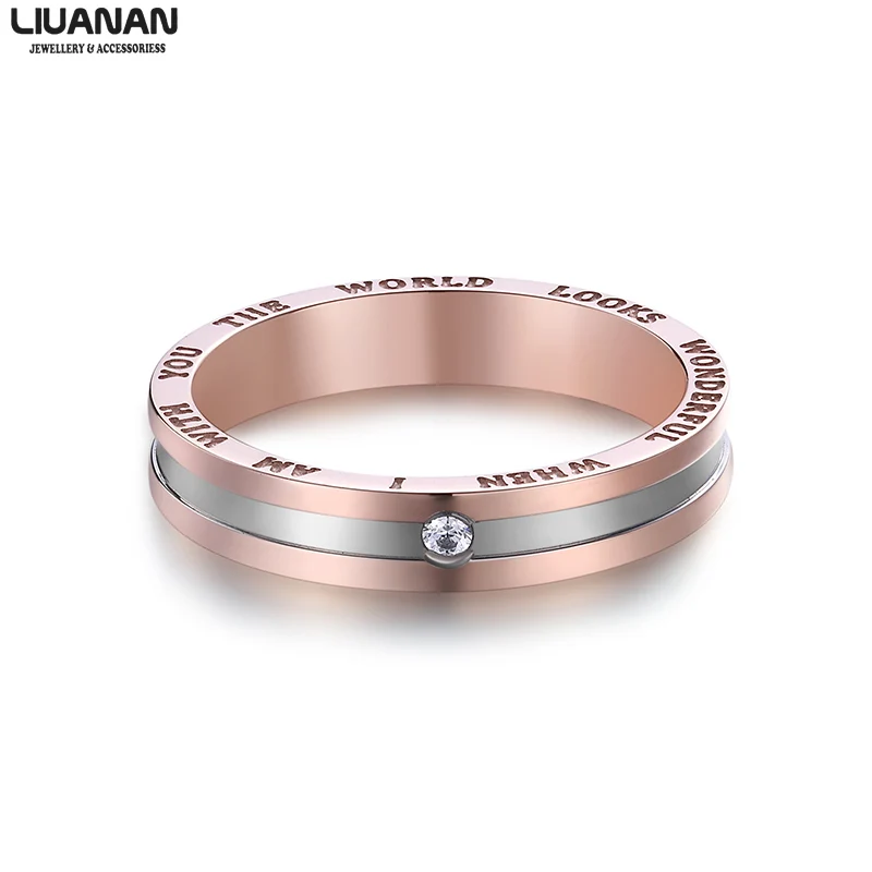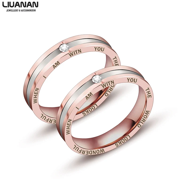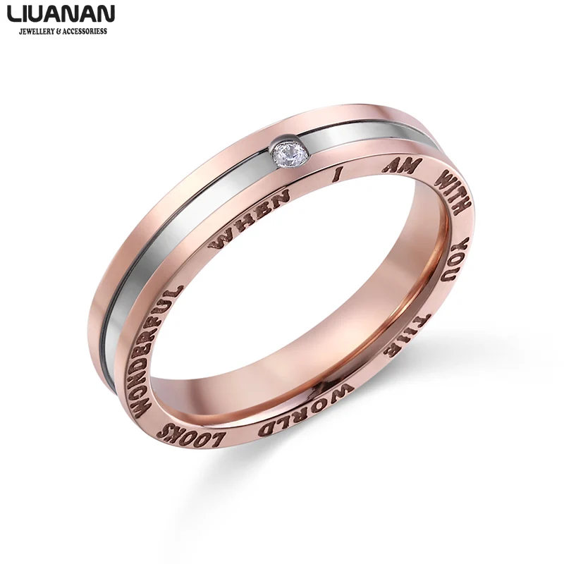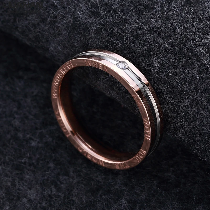 This couple ring is made of stainless steel, 18K rose gold plating and engraving at two sides, AAA cubic zirconia, grooved