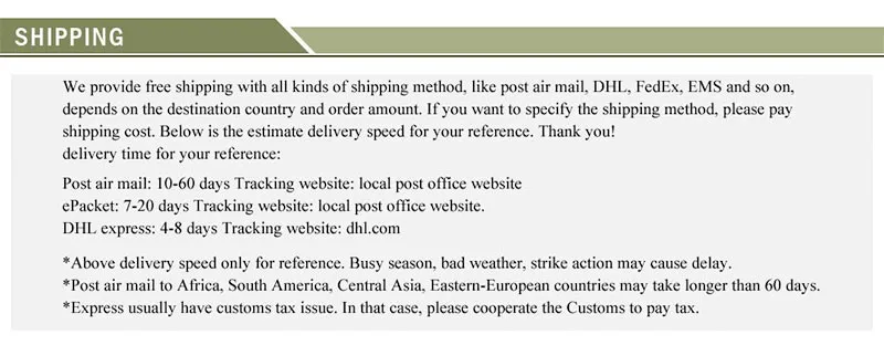 Packages from our warehouse in China will be shipped by ePacket or EMS depending on the weight and size of the product. Packages shipped from our US warehouse are shipped through USPS.