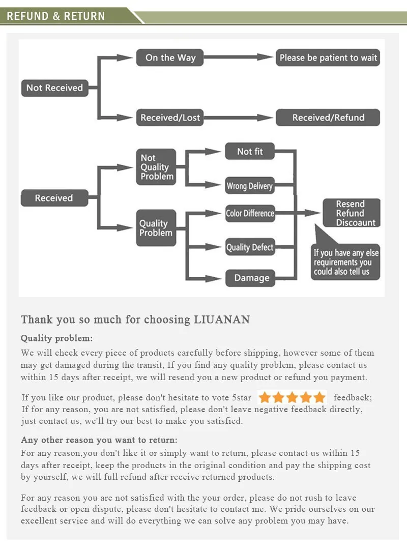 • If you did not receive the product within the guaranteed time( 45 days not including 2-5 day processing) you can request a refund or a reshipment.