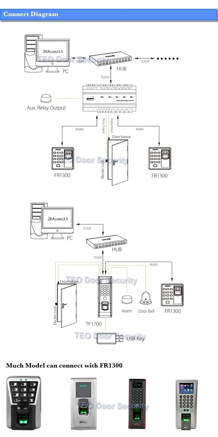 RS485 Slave Reader ZK FR1300 Support Fingerprint + RFID + Keypad Smart Finger Sensor With Doorbell 86cmx86cm Socket Installation
