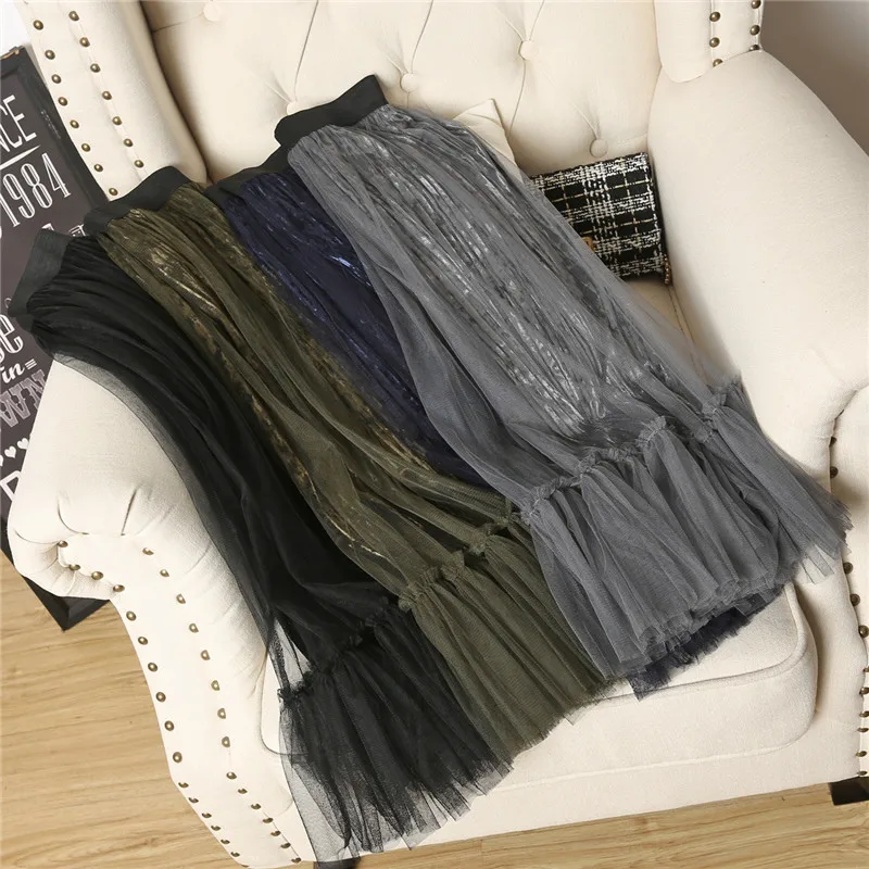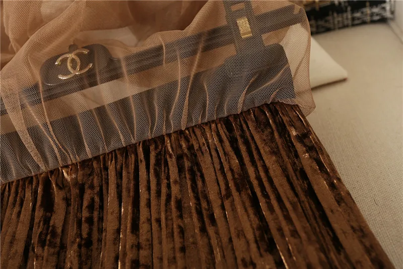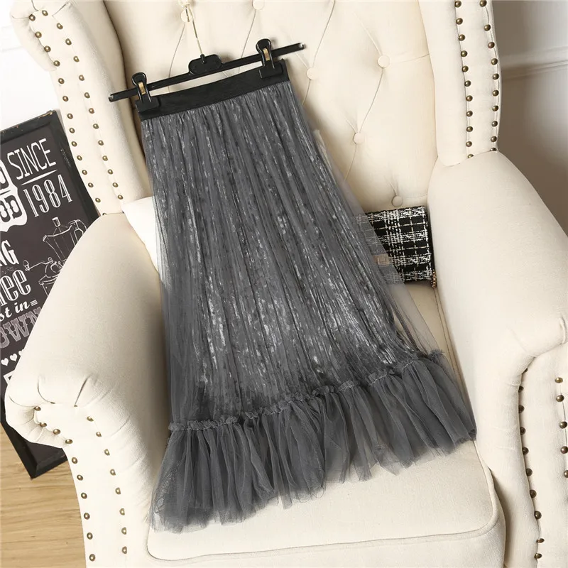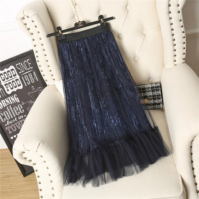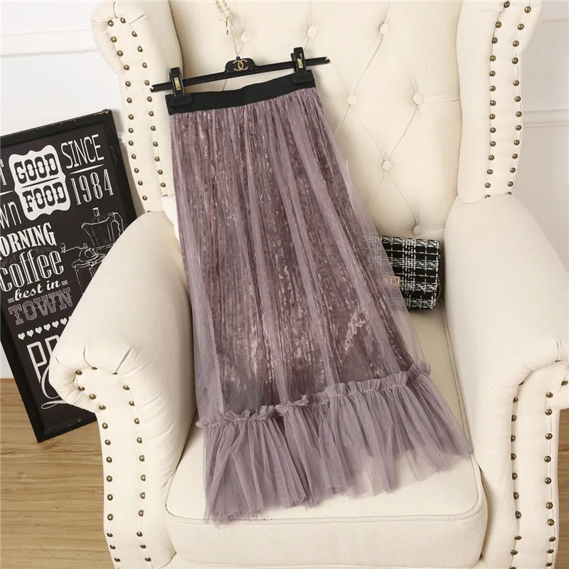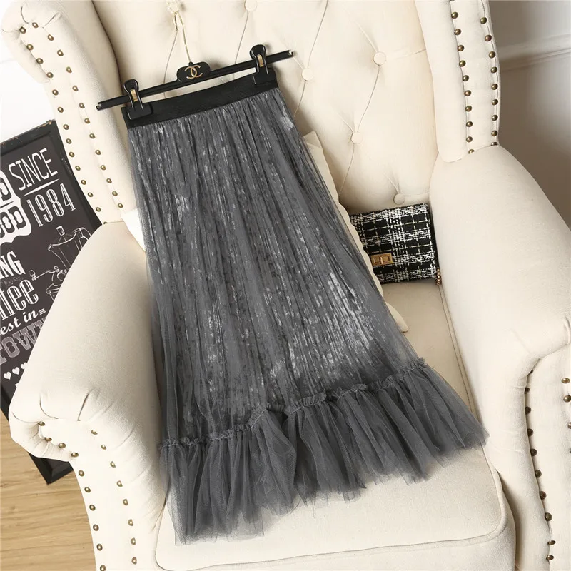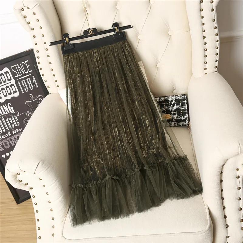 Ruffles guaze Gold velvet pleated medium long half slip double layer autumn and winter petticoat