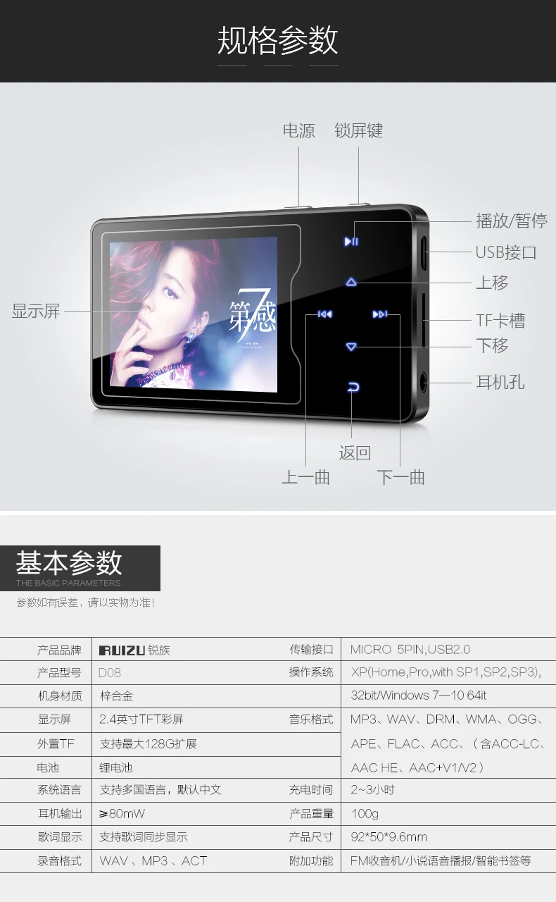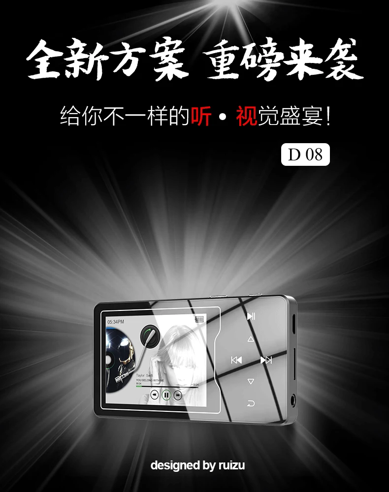 RUIZU D08 8GB Metal MP3 Player 2.4in HD Large Color Screen HIFI Lossless Sound FM Radio Ebook Video Player With Built-in Speaker