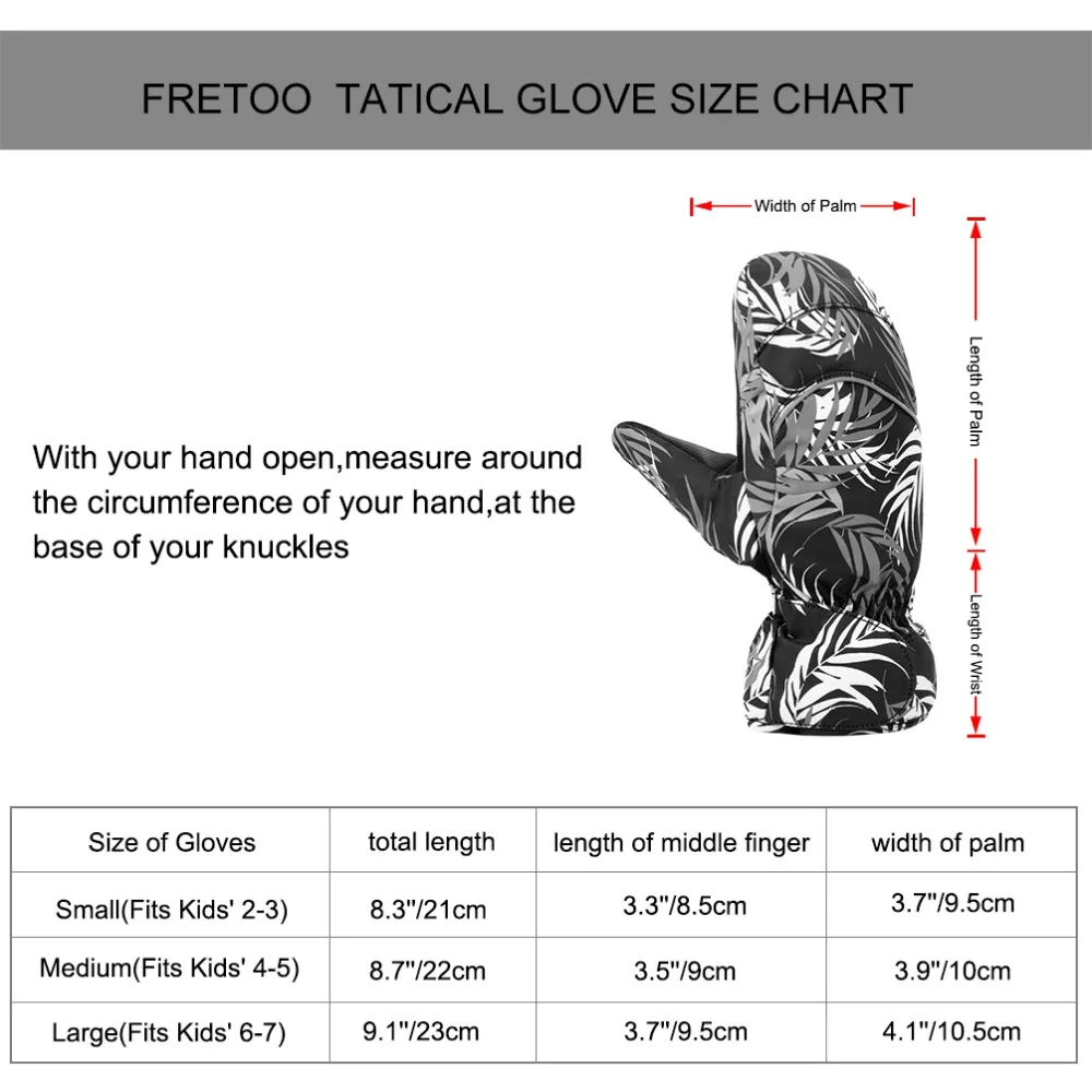 M: total length 8.7”/22cm; length of middle finger 3.5”/9cm; width of palm 3.9”/10cm; suitable for kids between 4-5 years old