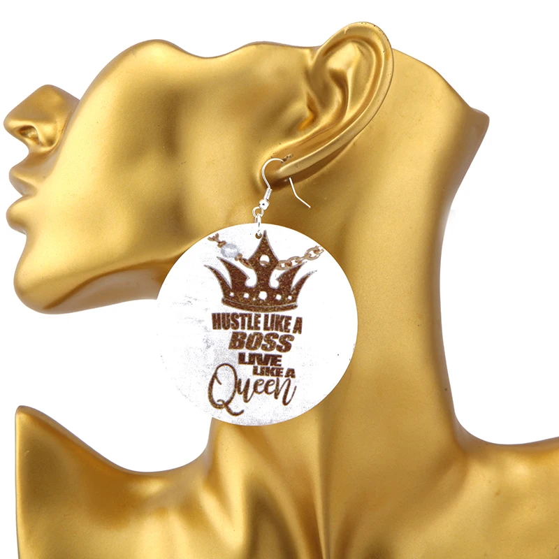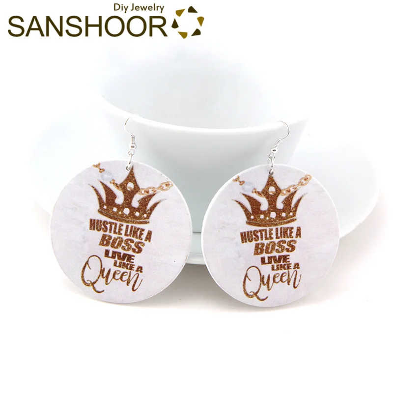 SANSHOOR Printed Crown Wood Drop Earrings Hustle Like A Boss Live Like A Queen Blacks Power Jewelry For Christmas Gifts 1Pair