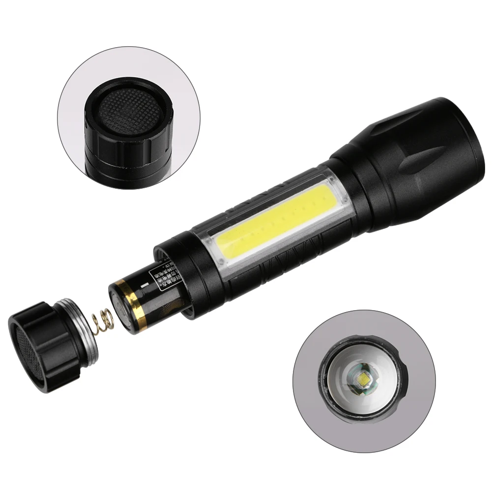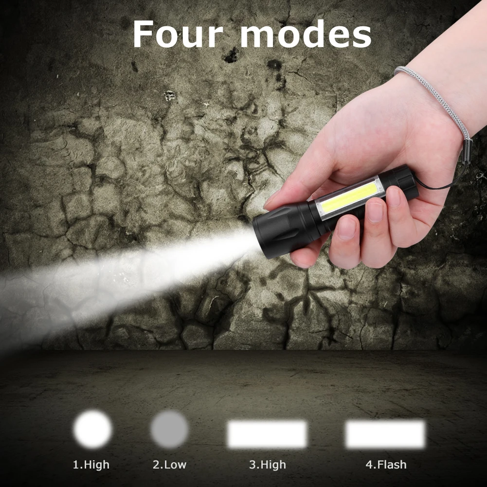 4 LED light modes: push button On/Off trigger switch with LED high light, LED low light, COB high light,COB strobe.