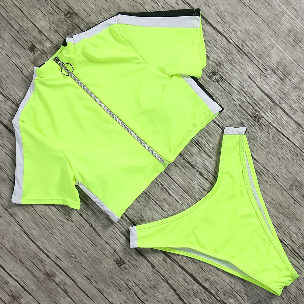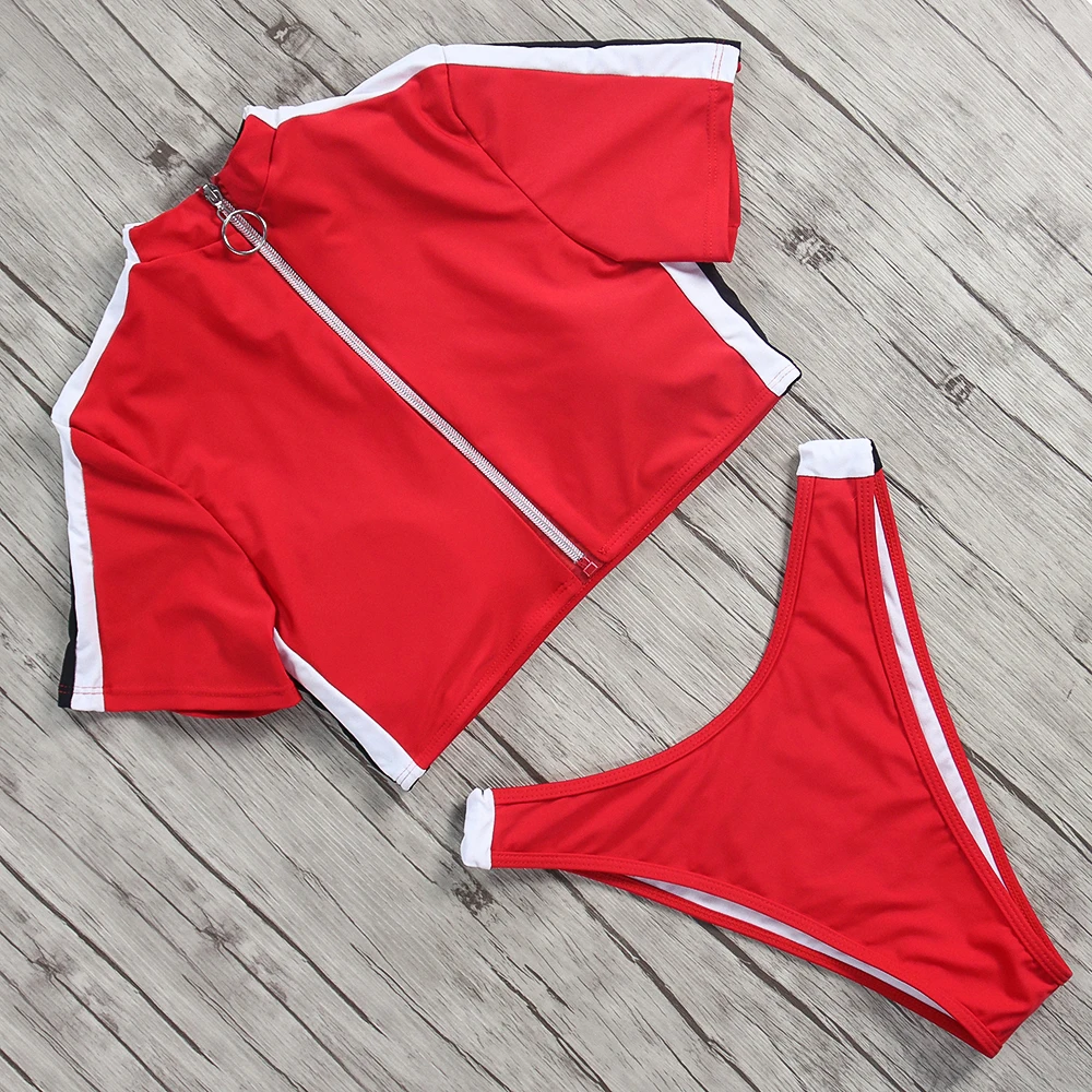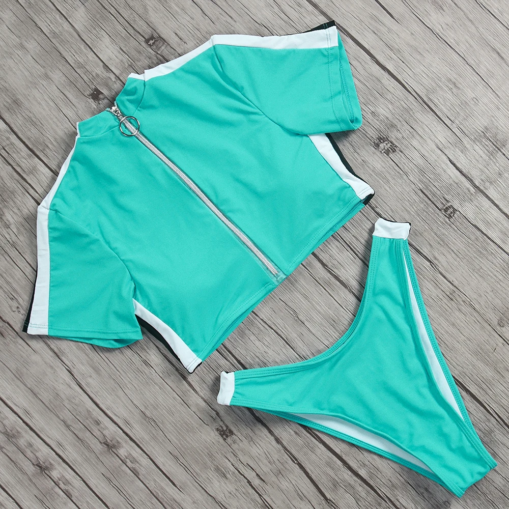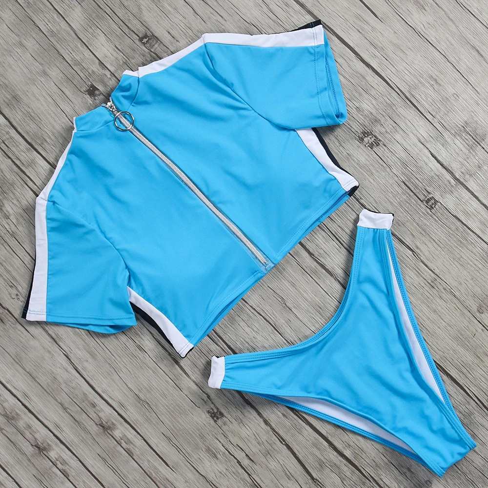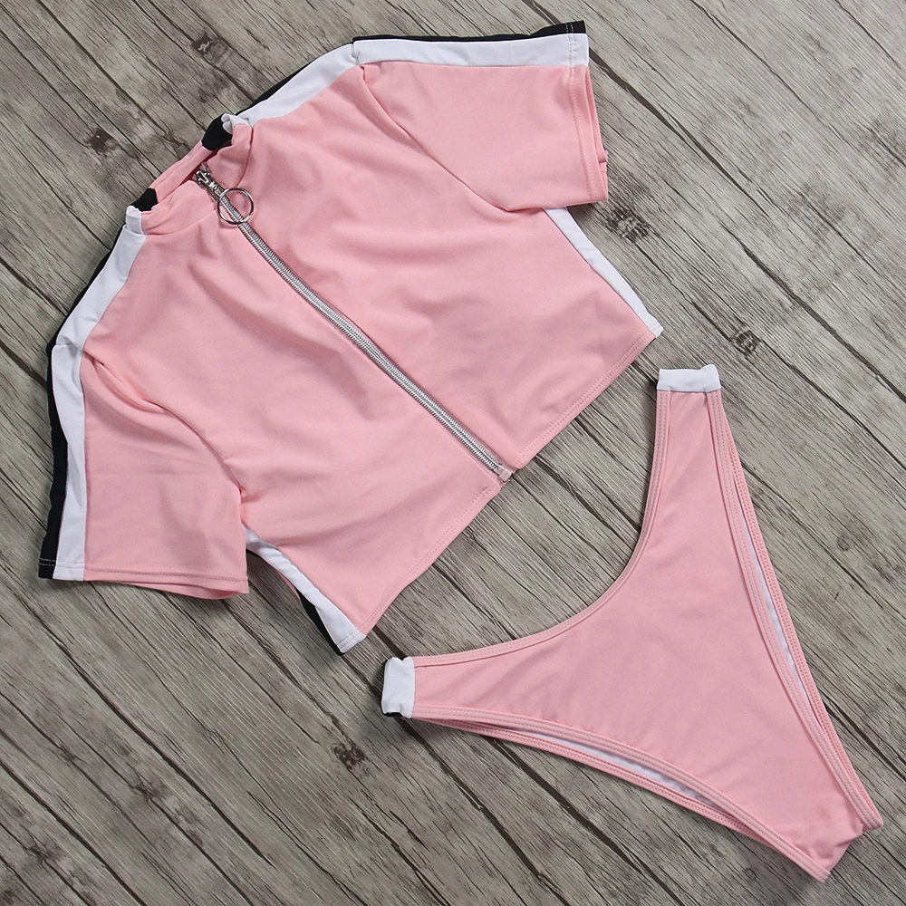 Sexy High Cut Waist Bikini Zipper Swimsuit Push Up Swimwear Women Bathing Suit Short Sleeve Bikini Set Female Beach Wear 2018