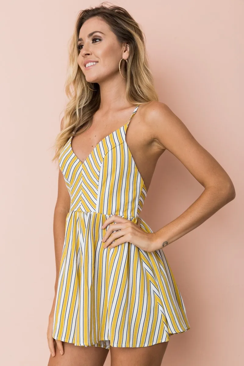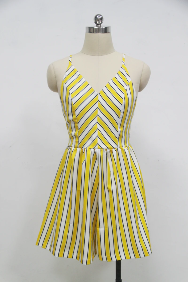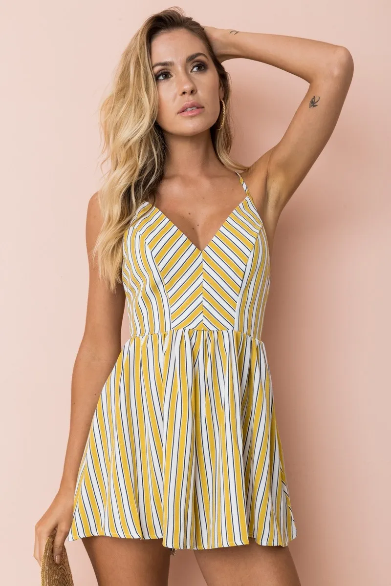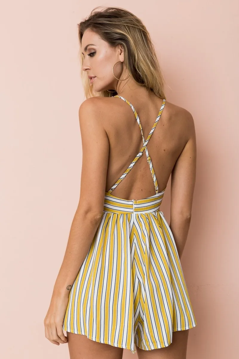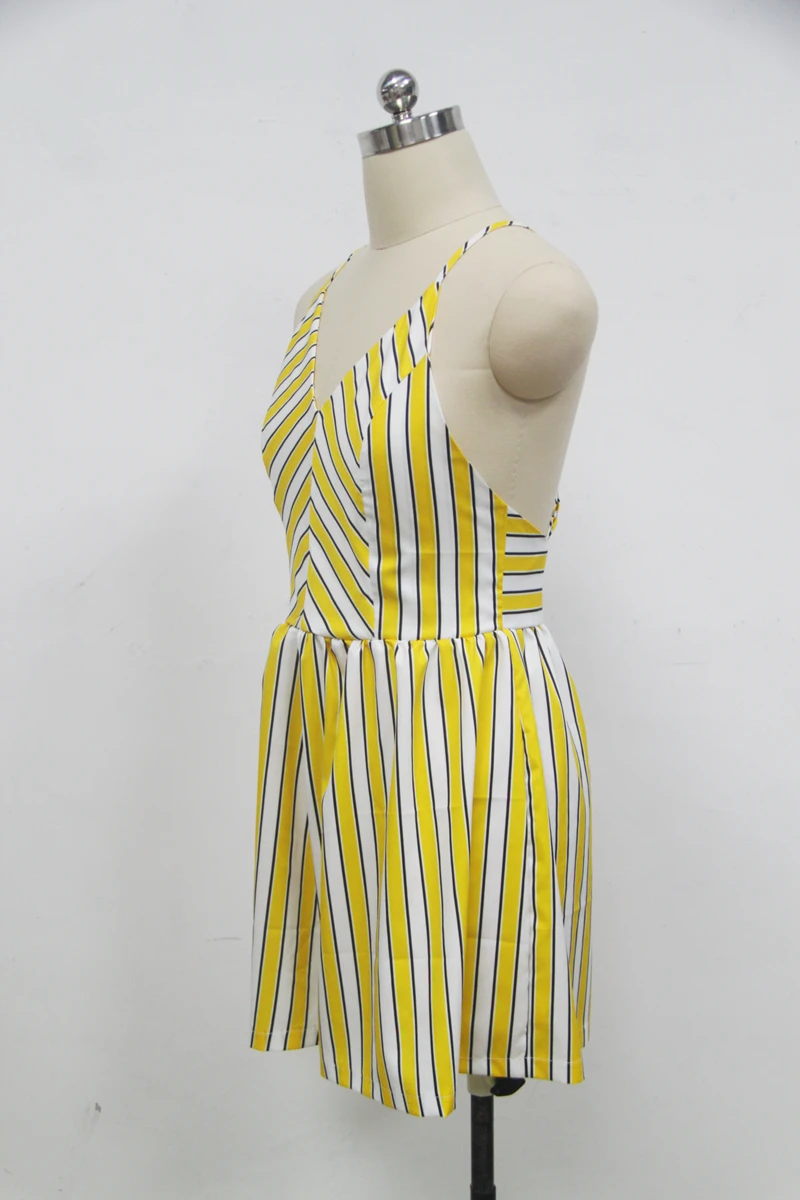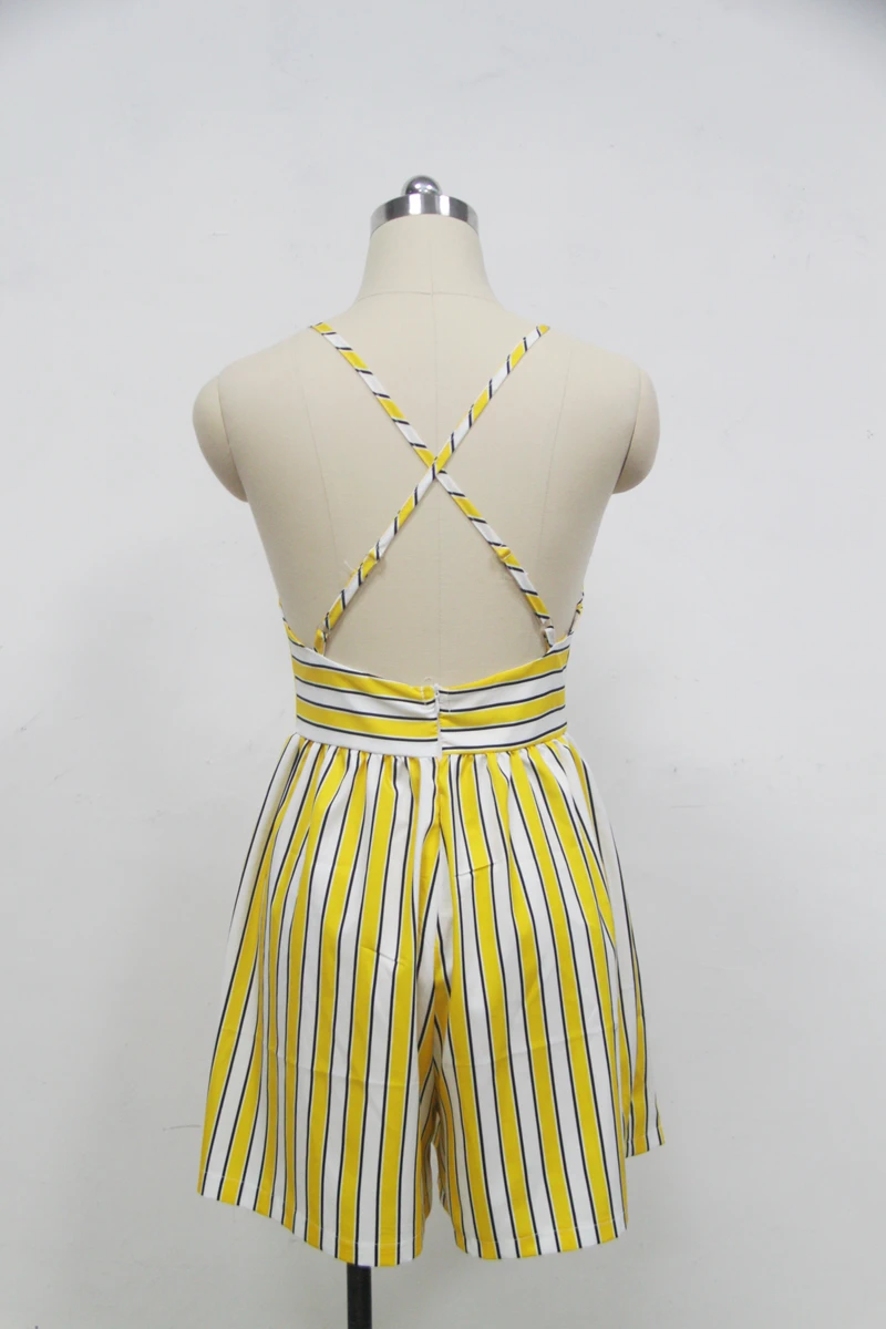 Sexy Jumpsuit Backless Playsuit Women Yellow Striped Spaghetti Strap Zipper Wide Legs Overalls Rompers Women macacao S86292