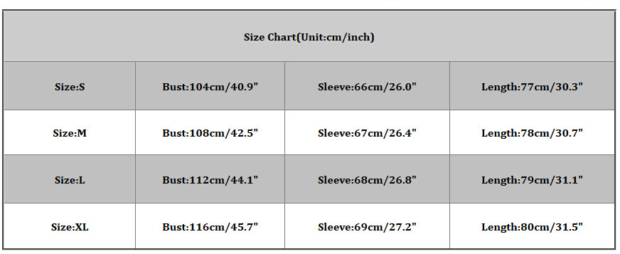 Size:XL Bust:116cm/45.7″ Sleeve:69cm/27.2″ Length:80cm/31.5″