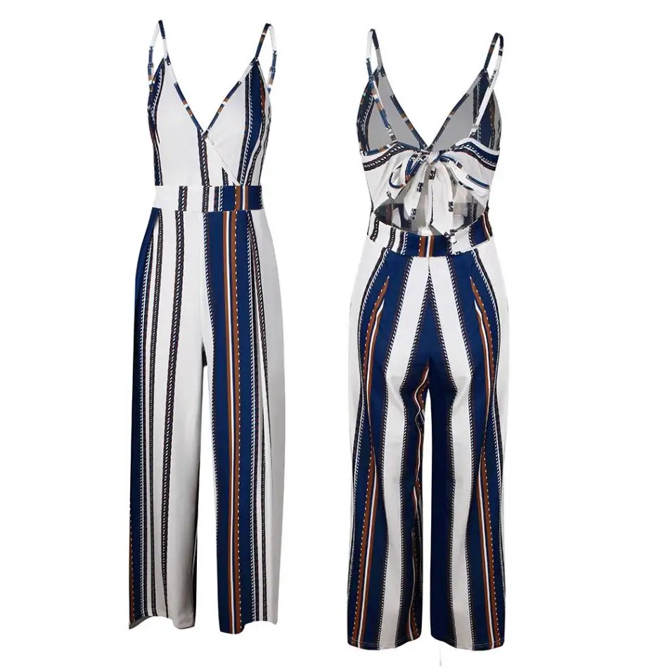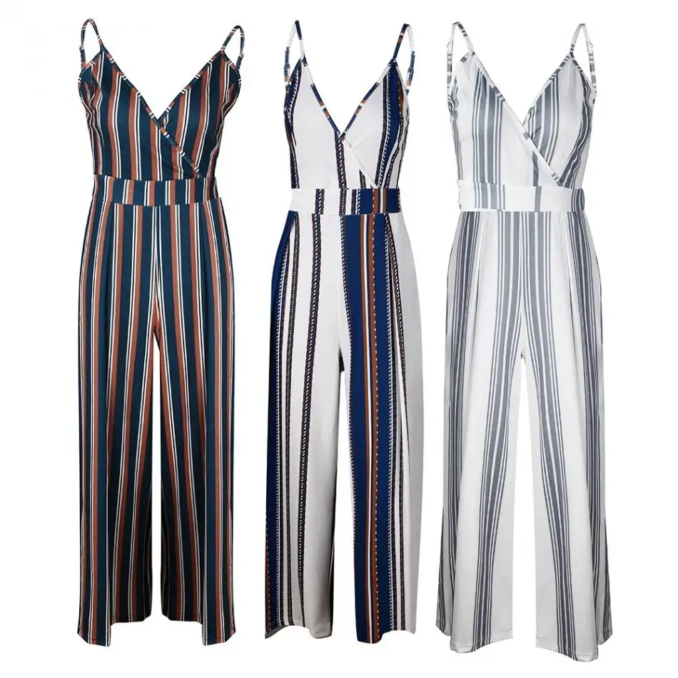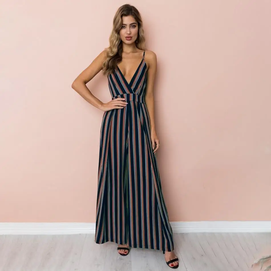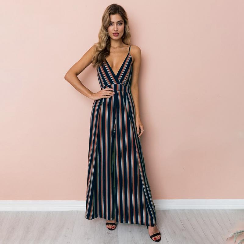 Sexy Women Striped Summer Jumpsuit Sleeveless Strappy High Waist Ladies Clubwear Deep V Neck Playsuit Bodycon Party Jumpsuit