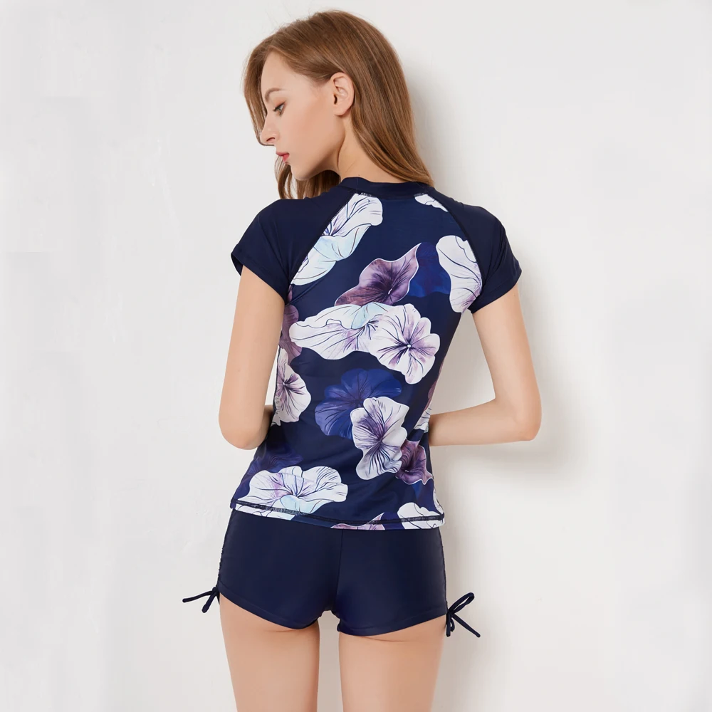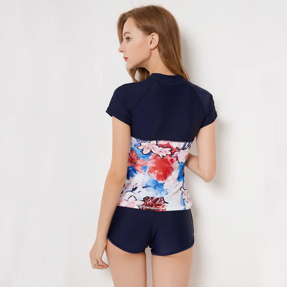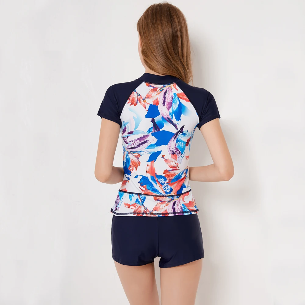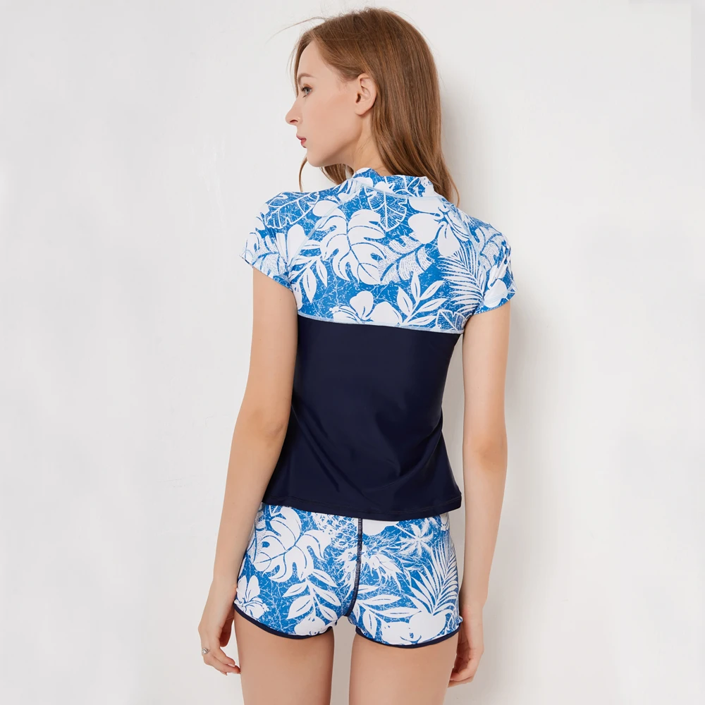 Sexy Zipper Leaf Floral Print Two Piece Swimming Suits Short Sleeve Plus Size Swimwear Female 2018 New Tankini Swimsuits Women