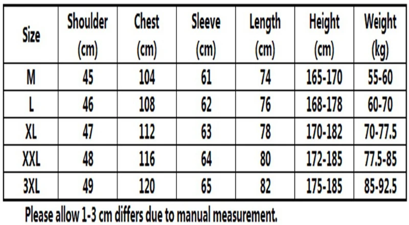 US XL/42 Tag(China XXL-185) ——-Chest 45.67″—Shoulder 18.90″—Sleeve 25.20″—Top Length 31.50″