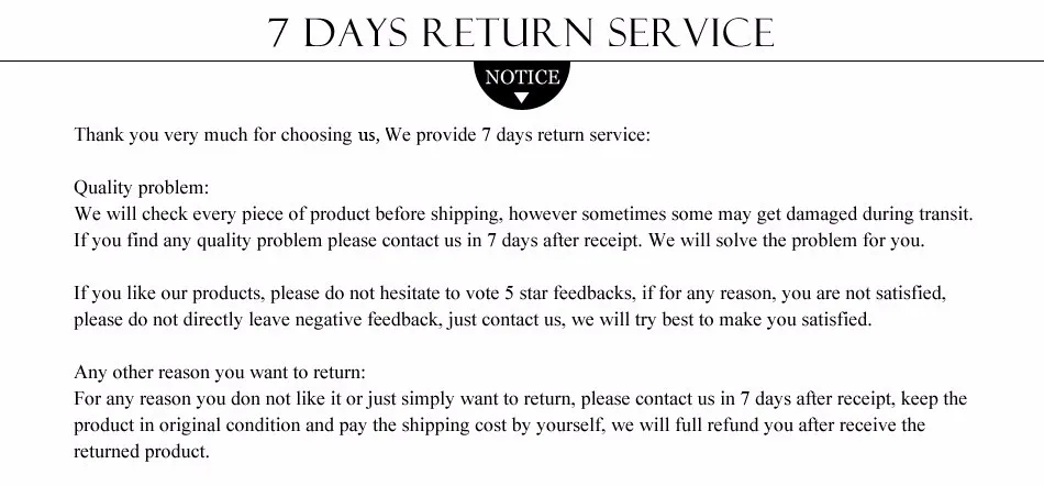 • If you did not receive the product within the guaranteed time( 45 days not including 2-5 day processing) you can request a refund or a reshipment.