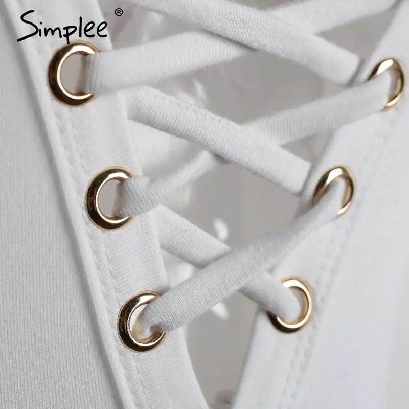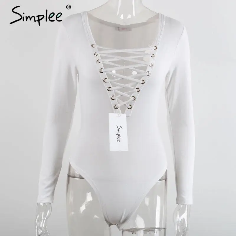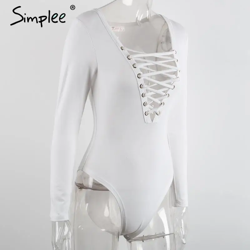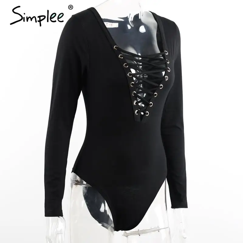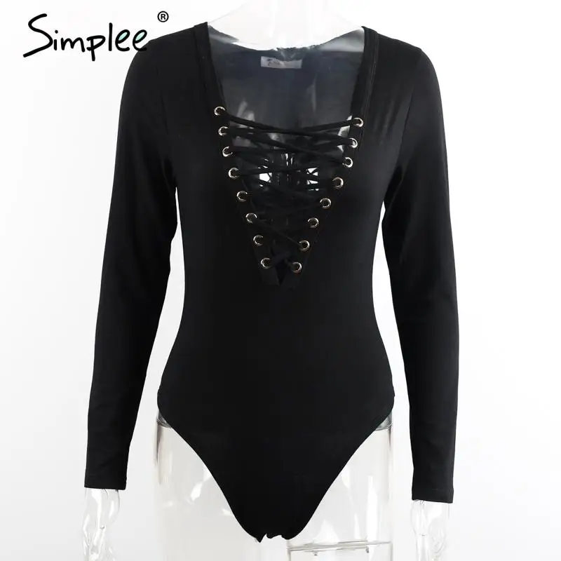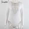 Simplee Cross lace up jumpsuit romper women Sexy v neck bandage bodysuit overalls Autumn winter knitted playsuit leotard